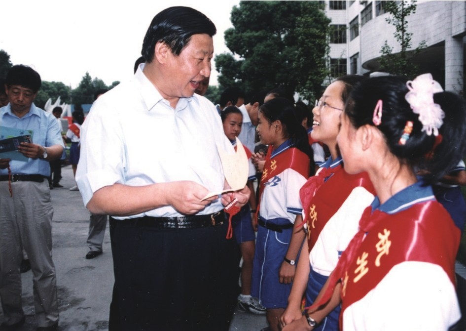 2003年9月,习近平在杭州市崇文实验学校调研时与学生亲切交谈