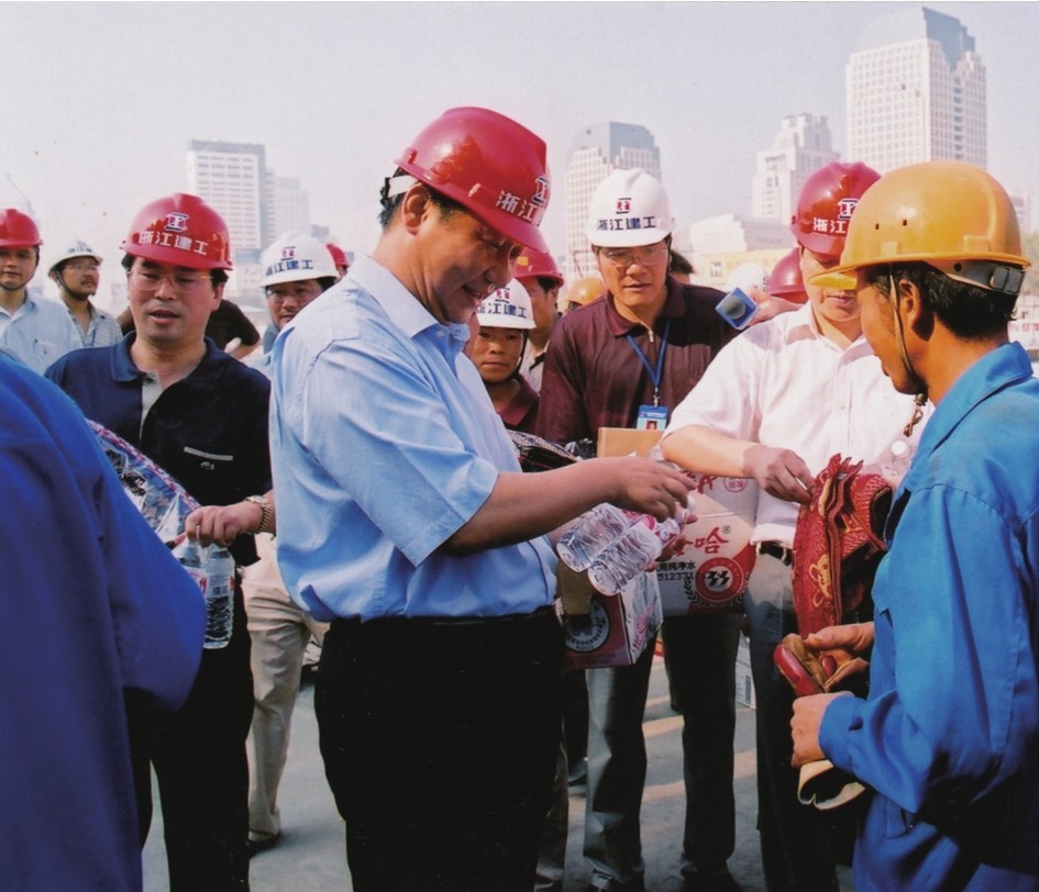 2004年8月6日是杭州入夏以来的第31个连续高温日。当天上午,他冒着酷暑,到西湖文化广场建设工地,慰问在高温下坚持一线作业的民工。他与正在扎钢筋的民工一一握手,送上矿泉水和毛巾等防暑降温品,关切地询问民工施工、生活和防暑等情况。他来到民工食堂,关切地问:“天气这么热,民工兄弟吃得怎么样?”看到餐厅干净整洁,摆有10多种蔬菜和鱼、肉等,他询问工作人员:“每天都能有这么多菜吗?价钱贵不贵?高温天气民工出汗多,能不能多提供一点饮料和汤类?”工作人员回答说:“民工一天花不到10元钱,就能吃饱吃好,汤是免费的。”习近平同志又特别关照:“要确保饭菜卫生”,“多煮点绿豆汤”。从民工食堂出来,习近平同志径直走进民工宿舍察看。他一再叮嘱随行的施工单位负责人:“民工远离家乡、远离亲人,我们更要关心、爱护和体贴他们。要合理调整作息时间,尽量避开高温时段高强度作业,确保民工健康,努力营造良好的施工环境。”