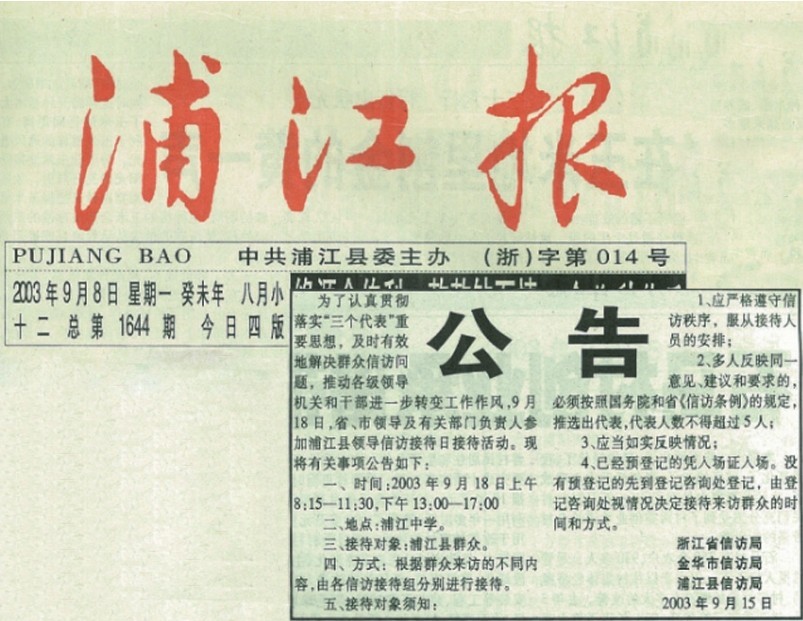 2003年9月,习近平率队赴浦江县下访时在媒体上提前发出公告