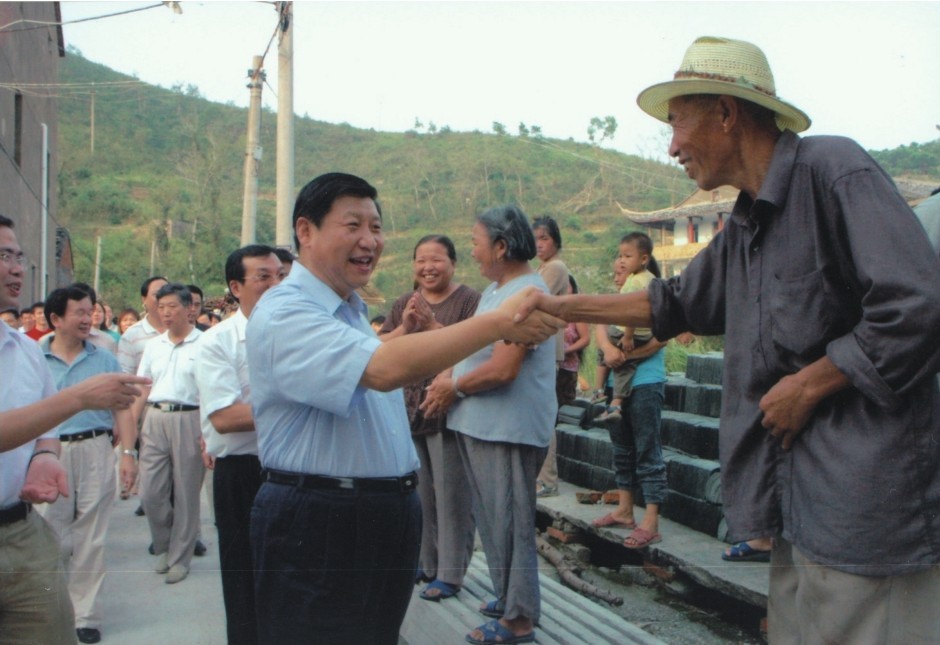 2005年9月,习近平在台州市临海市涌泉镇西洋村察看台风灾情,慰问受灾群众