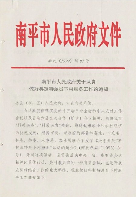 1999年1月,南平市政府印发《关于认真做好科技特派员下村服务工作的通知》