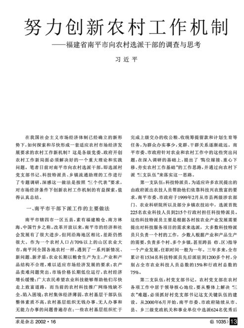 《求是》2002年第16期刊发习近平文章《努力创新农村工作机制——福建省南平市向农村选派干部的调查与思考》