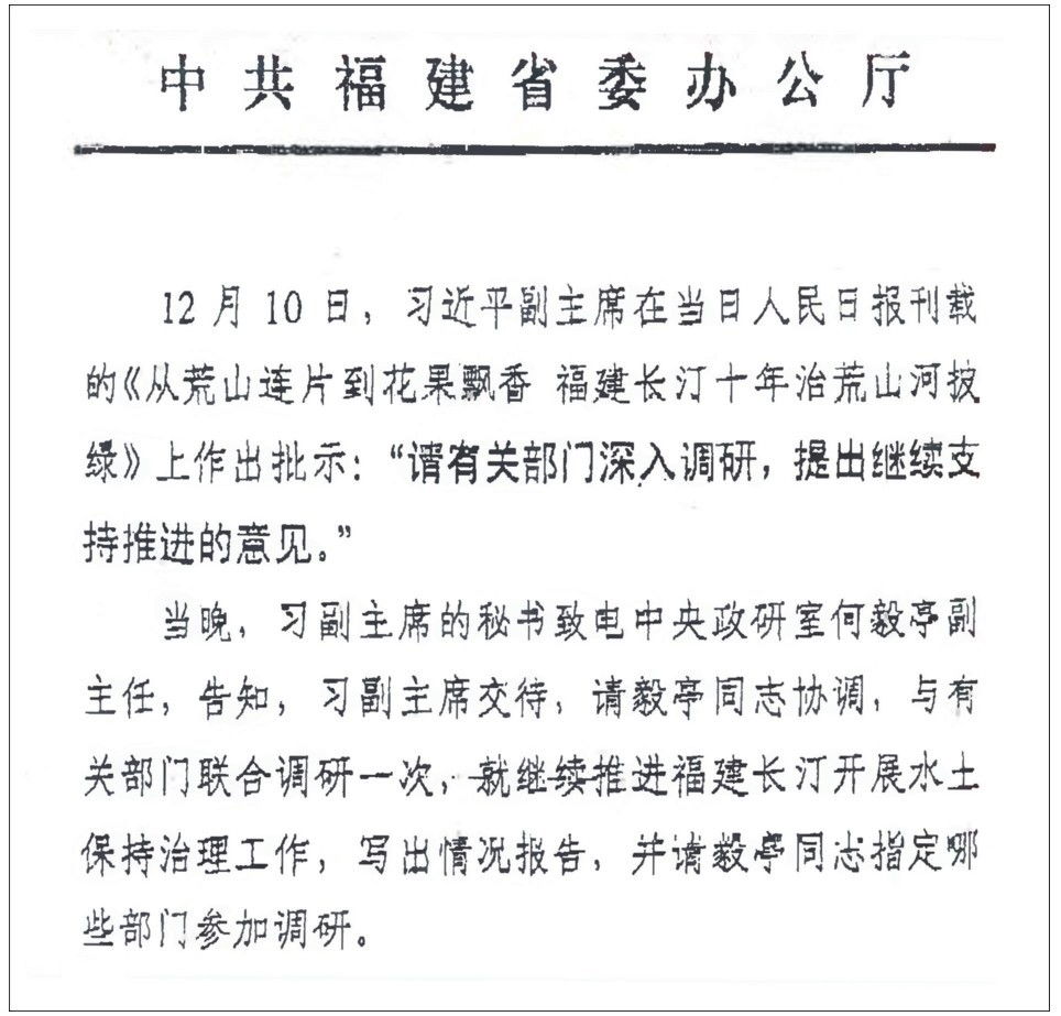 2011年12月,习近平对《人民日报》刊登的报道《从荒山连片到花果飘香 福建长汀十年治荒山河披绿》作出批示