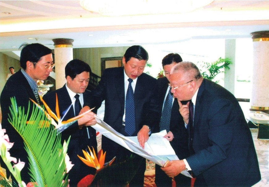 2001年10月,习近平赴港澳访问期间,与时任香港特首董建华(右一)商谈闽港合作设想和规划