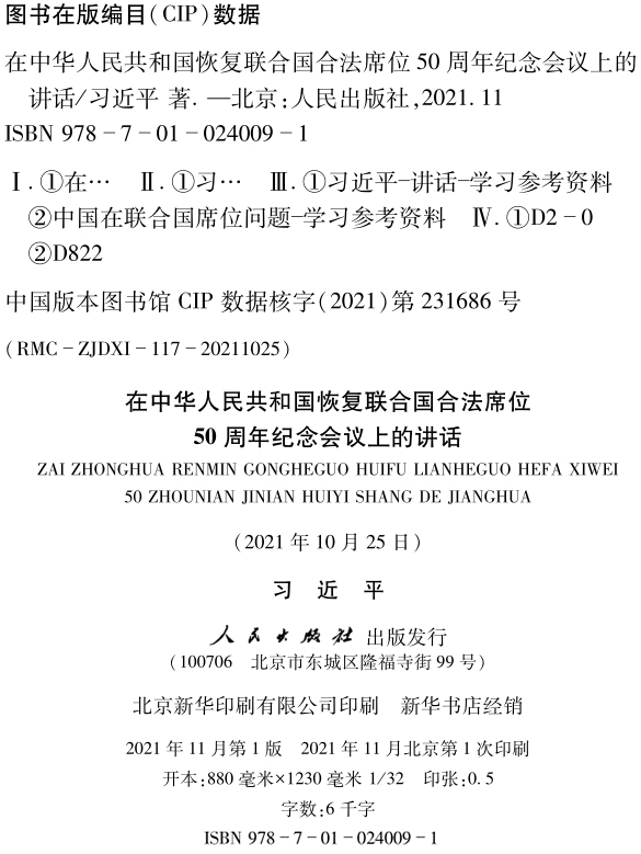 在中华人民共和国恢复联合国合法席位50周年纪念会议上的讲话
