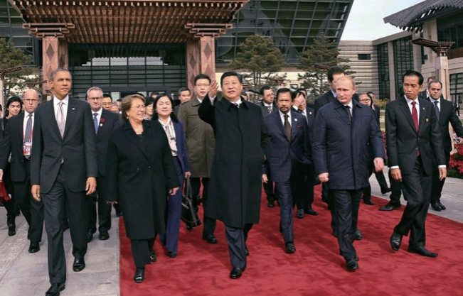2014年11月11日,亚太经合组织第二十二次领导人非正式会议在北京举行。图为会议期间,国家主席习近平与参会领导人步行前往种植亚太伙伴林