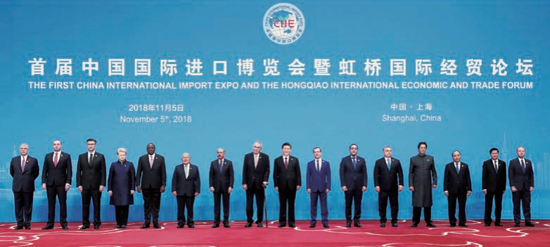 2018年11月5日,首届中国国际进口博览会在上海开幕。图为开幕式前,习近平主席同外方领导人集体合影