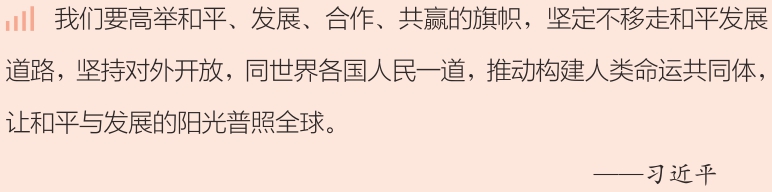 中华民族历来就是爱好和平的民族,中华民族的血液中没有侵略他人、称王称霸的基因。在5 000多年的文明发展中,中华民族一贯追求和睦和谐。近代百年的民族解放斗争,让中国人民对和平安定更为珍视。和平来之不易。无论是国家还是个人,都要珍惜今天的和平,积极表达爱好和平的愿望,主动承担维护世界和平的责任,为维护世界和平作出贡献。