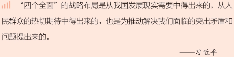 “四个全面”战略布局,是我们党在新的历史起点上把握我国发展新特征确定的治国理政方略。从党的十八大强调“全面建成小康社会”,到党的十八届三中全会部署“全面深化改革”,再到党的十八届四中全会要求“全面依法治国”,党的群众路线教育实践活动总结大会宣示“全面从严治党”,“四个全面”战略布局清晰展现。