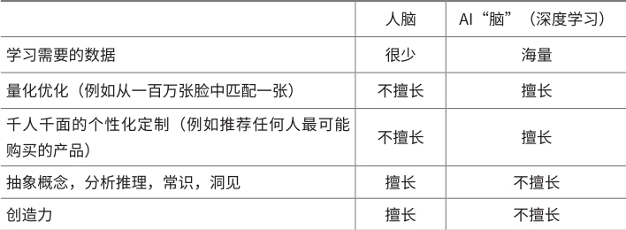 我们必须了解:AI“脑”(深度学习)和人的大脑是非常不一样的,从学习方法到擅长领域: