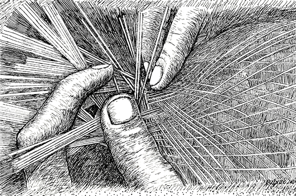 老人正在干活,看我进门,招招手,指指身旁的小板凳说,没见过你呢?她又低下头,专注于手里的活儿。老人六十来岁的样子,额上几道很深的皱褶,眼角的鱼尾纹刀刻一般。她手里是个小篓的半成品,两根竹篾上下翻飞,左盘右绕,这里拽一下,那里拉一下,我还没有看清到底是怎么编的,就已经快要完工,开始收边了。
