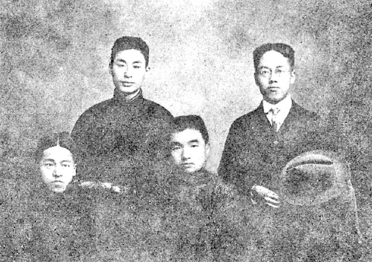 俞平伯行将渡洋赴美考察教育,1921年岁尽日,叶圣陶与朱自清、许昂若祖饯于杭州,并留影。照片上西服而持礼帽者为俞平伯,站于其右的是叶圣陶,朱自清坐于正中,许昂若坐于其右。