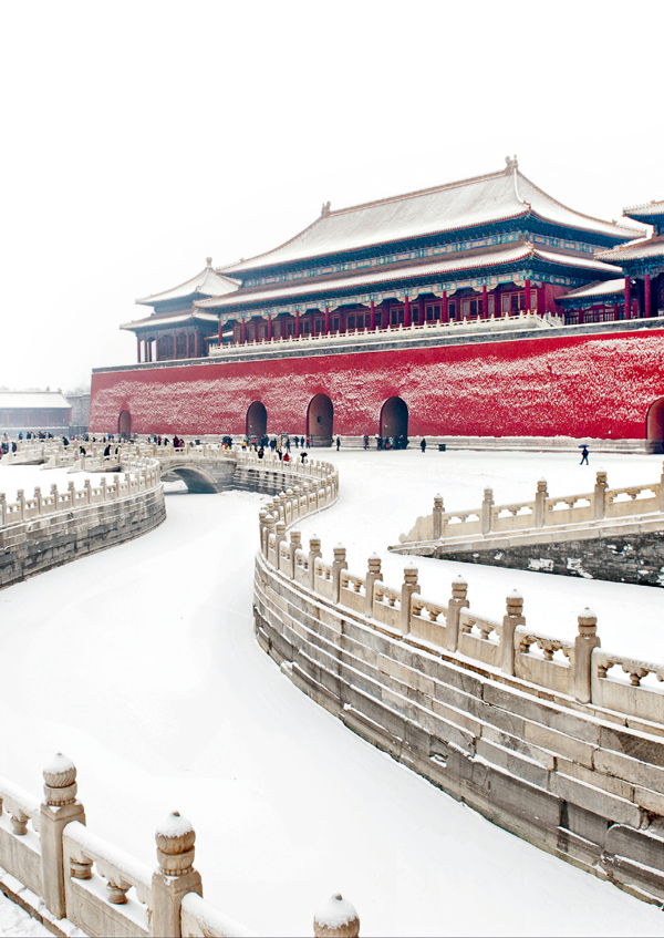 三大殿的前面有两段作为序幕的布局,是值得注意的。第一段,由天安门,经端门到午门,两旁长列的“千步廊”是个严肃的开端。第二段在午门与太和门之间的小广场,更是一个美丽的前奏。这里一道弧形的金水河和河上五道白石桥,在黄瓦红墙的气氛中,北望太和门的雄劲,这个环境适当地给三殿做了心理准备。