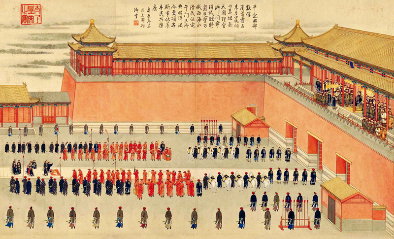 献俘礼上,百官着朝服按序而立,俘虏被白绳牵着脖子,先去告祭太庙,祭祀社稷,然后再拉到午门,端坐在午门门楼上的皇帝如果说一声“拿去”,俘虏将会被处决。准噶(gá)尔汗国的末代之君达瓦齐是俘虏中幸运的一位,乾隆皇帝赦免了他,并封他为亲王,赐给府第。而五十年之后拥兵十万叛乱的张格尔和卓就没那么幸运,道光皇帝没有赦免他。这次午门受俘是大清皇帝最后一次登临午门城头宣示天威。十多年之后,鸦片战争爆发。