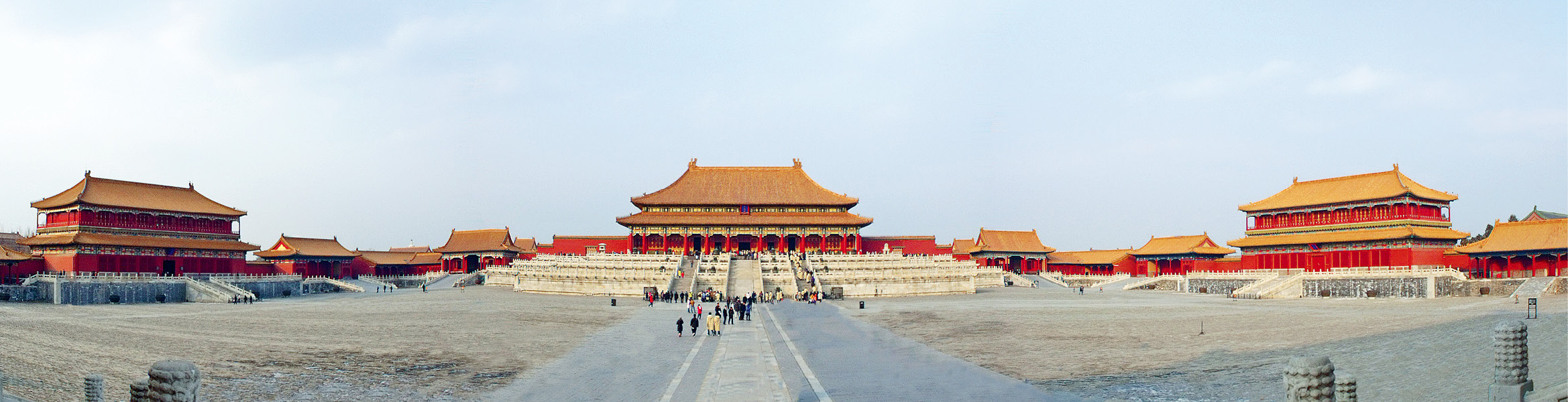 太和、中和、保和三座殿是前后排列着同立在一个庞大而崇高的工字形白石殿基上面的。这种台基过去称“殿陛”,共高二丈,分三层,每层有刻石栏杆围绕,台上列铜鼎等。台前石阶三列,左右各一列,路上都有雕镂隐起的龙凤花纹。这样大尺度的一组建筑物,是用更宏大尺度的庭院围绕起来的。广庭气魄之大是无法形容的。庭院四周有廊屋,太和与保和两殿的左右还有对称的楼阁和翼门,四角有小角楼。这样的布局是我国特有的传统,常见于美丽的唐宋壁画中。