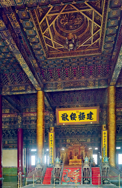三殿中,太和殿最大,也是全国最大的一个木构大殿。横阔十一间,进深五间,外有廊柱一列,全个殿内外立着八十四根大柱。殿顶是重檐的“庑殿式”瓦顶,全部用黄色的琉璃瓦,光泽灿烂,同蓝色天空相辉映。底下彩画的横额和斗栱,朱漆柱,金琐窗,同白石阶基也作了强烈的对比。这个殿建于康熙三十六年(一六九七年),已有二百五十五岁,而结构整严完好如初。内部渗金盘龙柱和上部梁枋藻井上的彩画虽稍剥落,但仍然华美动人。