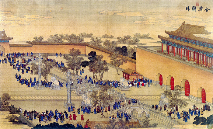 《胪欢荟景图册》局部“珠联璧合”,展示乾隆年间各国使者带着奇珍异宝在天安门外等候接见的情况 作者 佚名