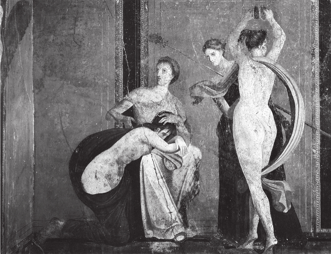 宙斯行为淫乱,他的情人很多,壁画描绘了宙斯的怀孕的情人塞勒涅,腹中的孩子即是酒神狄俄尼索斯。
