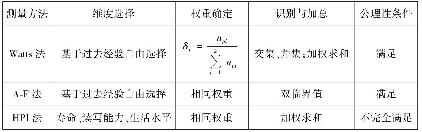 在多维贫困测度法中,基于对维度选择、权重确定以及综合指数合成等关键理解的差异,现已形成一系列多维贫困测度方法。本节仅对影响深远、应用广泛的几类方法进行阐述。