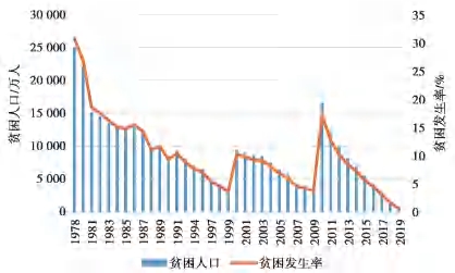 由此可以看出,改革开放以来,我国贫困发生率不断下降,贫困人口不断减少,扶贫攻坚工作取得了巨大成功。根据1978年的标准,贫困人口从改革开放初期的2.5亿人,到21世纪初降至9 422万人,截至2019年我国存在的贫困人口不足千万。尽管在部分年份贫困发生率存在升高的现象,但是整体上改革开放40多年来,我国的贫困情形呈下降趋势。然而,随着贫困发生率持续下降,扶贫攻坚工作的难度将不断提升,贫困人口脱贫的困难将不断增大,扶贫脱贫工作急需新方法、新思路,更加有效地推进。