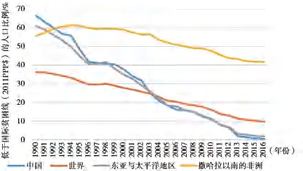 按照2011年购买力平价原理计算,以每人每天1.9美元的国际贫困线标准,中国和世界其他地区的贫困人口发展趋势如图1.2所示。在1990—2016年的20多年时间内,除撒哈拉沙漠以南的非洲地区以外(该地区的贫困状况在2002年后才开始发生略为明显的好转),世界各地贫困人口的发展状况持续好转,始终保持着稳定下降的趋势。其中,中国的贫困减少状况尤为清晰明显。在20世纪末,中国的贫困状况甚至比撒哈拉沙漠以南的非洲地区还要恶劣,但自中国政府致力于扶贫工作并加入国际扶贫组织以来,中国贫困人口减少的速度显著高于全世界的整体水平,并于2005年中国贫困人口比例首次低于世界平均水平,在此后的时间里进一步推动其扶贫工作,为世界各国的贫困发展态势作出示范性贡献。2005年以来,我国贫困发生率的降低与东亚及太平洋地区高度吻合,说明我国对该地区的减贫工作做出了巨大的贡献,我国贫困减少幅度始终引领着东亚及太平洋地区的减贫趋势。正是鉴于自20世纪80年代以来贫困状况改变的悬殊分化,有学者甚至提议中国或许可以成为非洲国家的“经济发展模板”