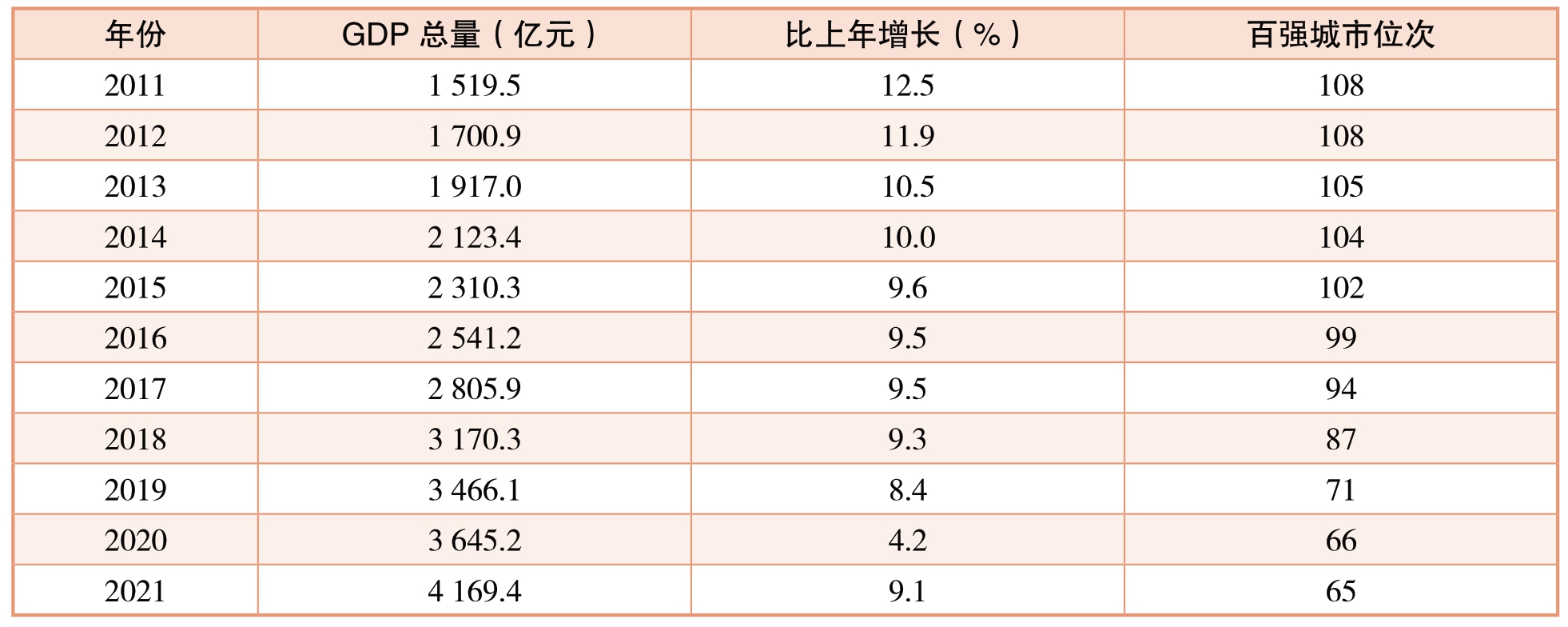2011年,赣州市GDP为1 519.51亿元,经过十年发展,先后跃上2 000亿元、3 000亿元和4 000亿元三个台阶,2021年GDP达到4 169.37亿元,比2011年扩大了1.74倍,在全省所占比重由13.1%提高到14.1%,地区生产总值翻一番的目标,于2018年就已提前实现;赣南苏区范围的所有县(市、区)均实现十年翻番。赣州市自2016年跻身全国城市GDP百强榜以来,位次不断前进,2021年进入第65位,比2011年前移了43位,赣州市在全国区域经济版图中的地位明显提升,如表1-1所示。