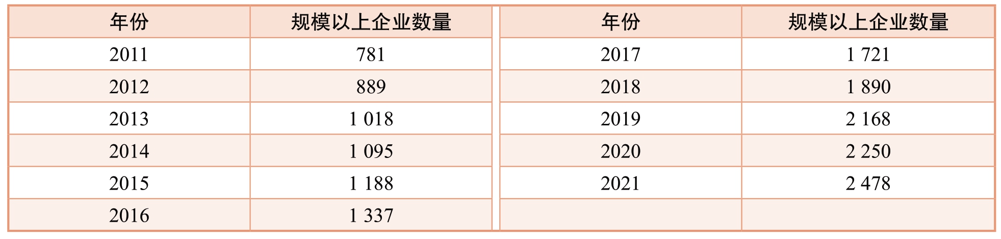 表1-7 2011—2021年赣州市规模以上企业数量变化情况 单位:家