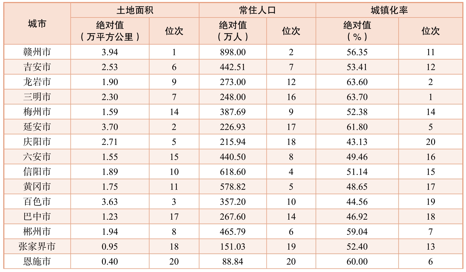 (1)从城市规模看,赣州是地域和人口大市,但城市化进程偏慢。赣州土地面积(3.94万平方公里)和常住人口(898万人)分列20个重点革命老区重点城市第1、2位,为名副其实的地域、人口大市,但城镇化率(56.35%)排名第11位,比前3位的三明、龙岩、临沂市分别低7.35个、7.25个、6.65个百分点,如表1-18所示。