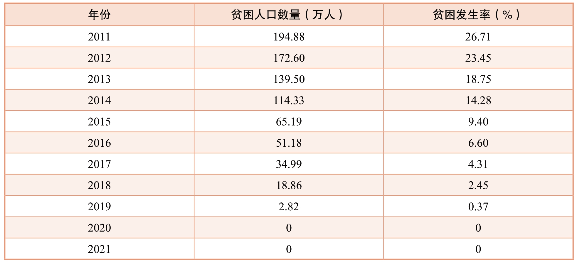 赣南苏区作为典型的集中连片特困地区,贫困人口基数非常大,2011年底有贫困人口约194.88万人,贫困发生率高达26.71%(是江西省的2倍),有贫困县11个。面对极其艰巨的脱贫攻坚任务,赣州市坚持以脱贫攻坚贯穿经济社会发展全局,集中资源,尽锐出战,取得脱贫攻坚全面胜利,贫困人口全部脱贫、1 023个贫困村(含167个深度贫困村)全部出列、11个贫困县全部摘帽,贫困发生率由2011年的26.71%降至0,创造了新中国成立以来赣州市最大规模人口脱贫的奇迹,如表1-2所示。