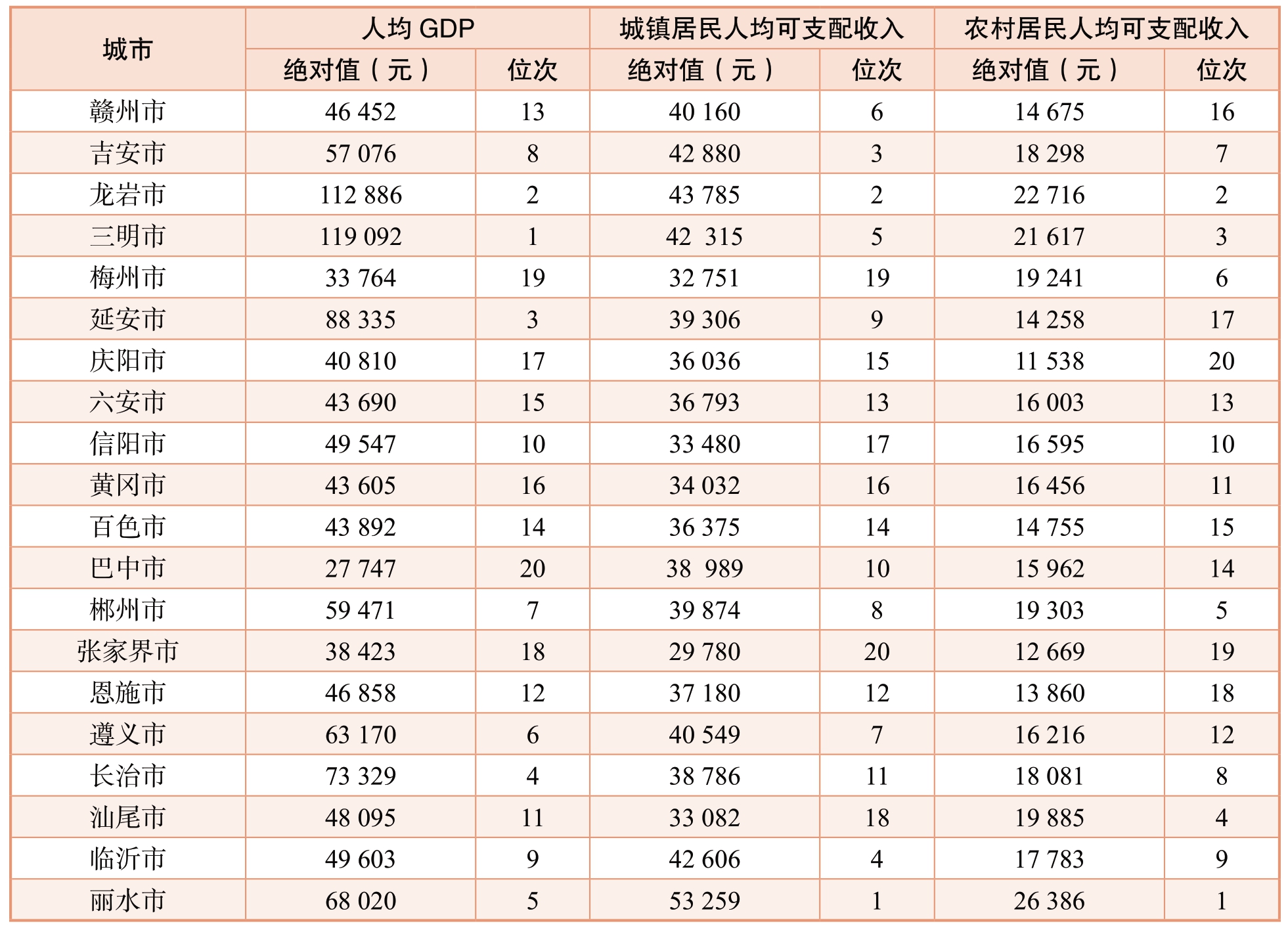(3)从人均水平看,赣州总体靠后,与先进地区相比有很大差距。2021年赣州市人均GDP(46 452元)在革命老区重点城市中列第13位,分别仅为前3位三明、龙岩、延安市的39.0%、41.1%、52.6%;农村居民人均可支配收入(14 675元)列第16位,分别仅为前3位丽水、龙岩、三明市的55.6%、64.6%、67.9%;城镇居民人均可支配收入(40 160元)列第6位,但仍然仅为第1位丽水市的75.4%,如表1-20所示。