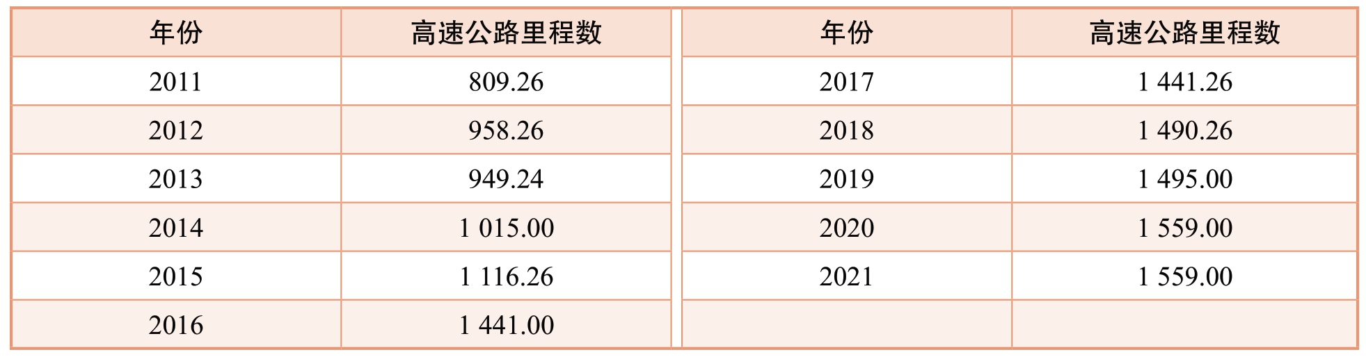 表1-10 2011—2021年赣州市高速公路里程数变化情况 单位:公里