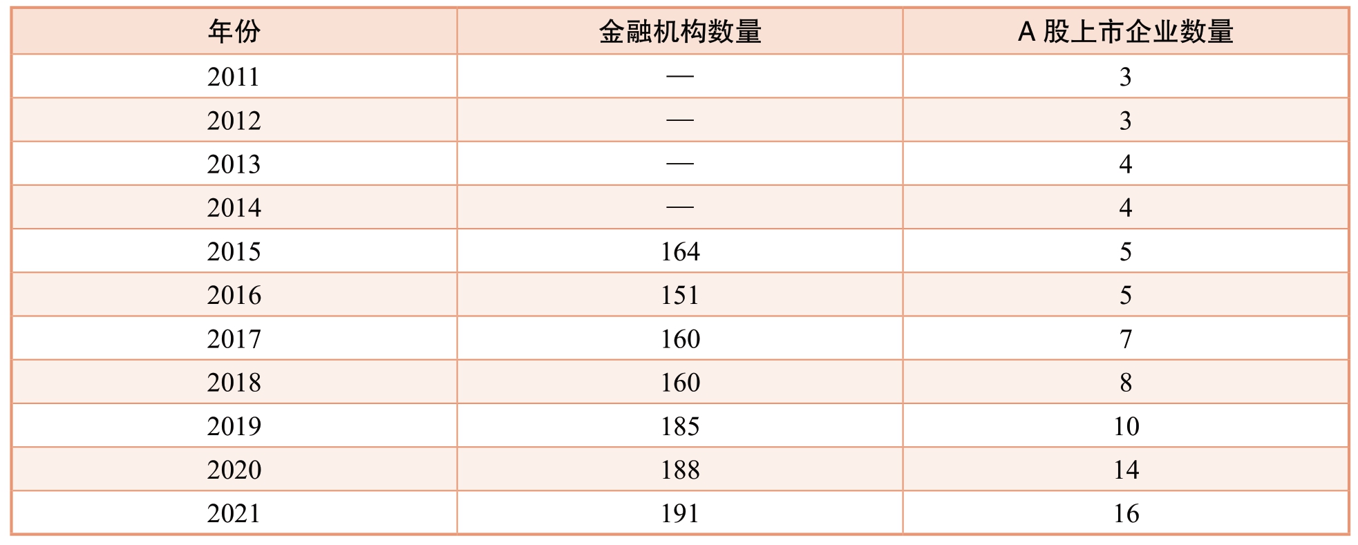 表1-9 2011—2021年赣州市金融机构及A股上市企业数量变化情况 单位:家