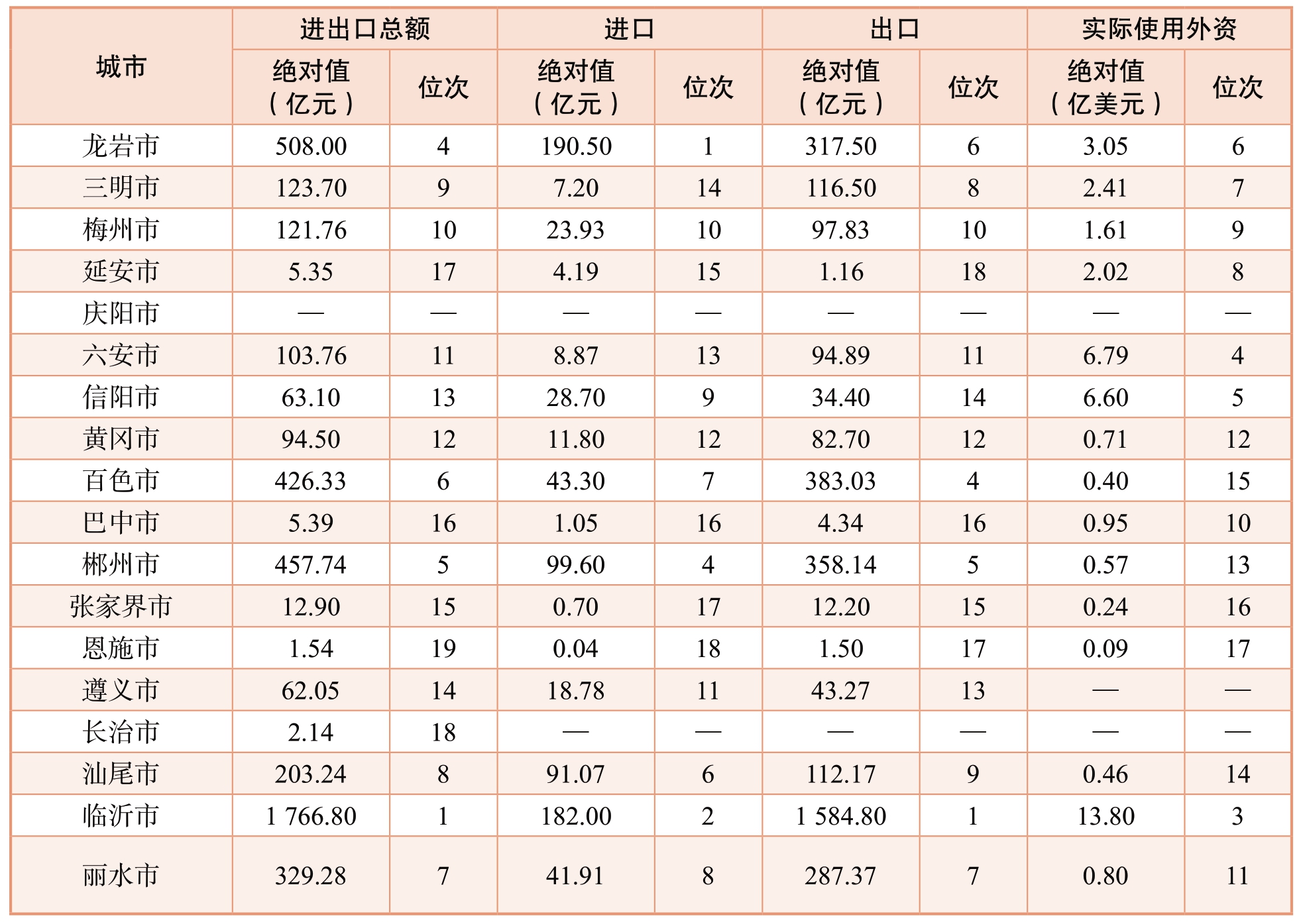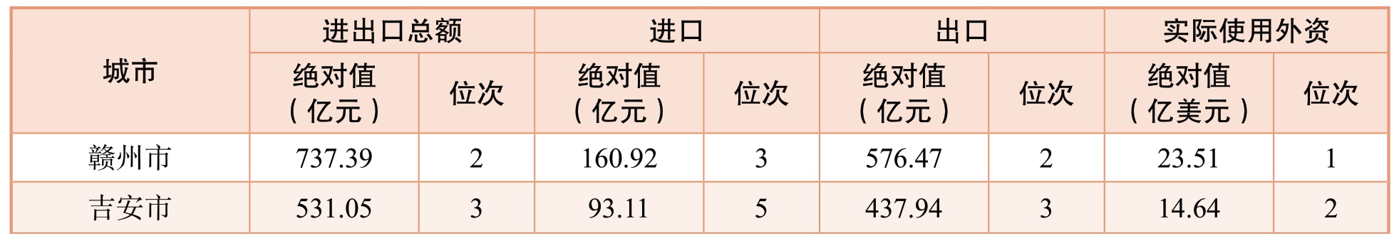 (2)经济外向度及营商环境优势。赣州既是中国沿海腹地,又是内地前沿,毗邻粤港澳大湾区,是赣闽粤湘四省通衢唯一的省域副中心城市、对接融入粤港澳大湾区的桥头堡,具有承南启北、呼东应西的区位优势。同时,赣州拥有3个国家级经济技术开发区、1个国家级高新区、1个综合保税区和我国中部除武汉外的第二个内陆口岸,是全国革命老区中唯一拥有铁路、公路、航空三大口岸的城市,开放设施体系相对较为完备,对外资的吸引力强,2021年赣州市在20个革命老区重点城市中实际使用外资(23.51亿美元)、进出口总额(737.39亿元)分列第1、2位,经济外向度较高,如表1-15所示。