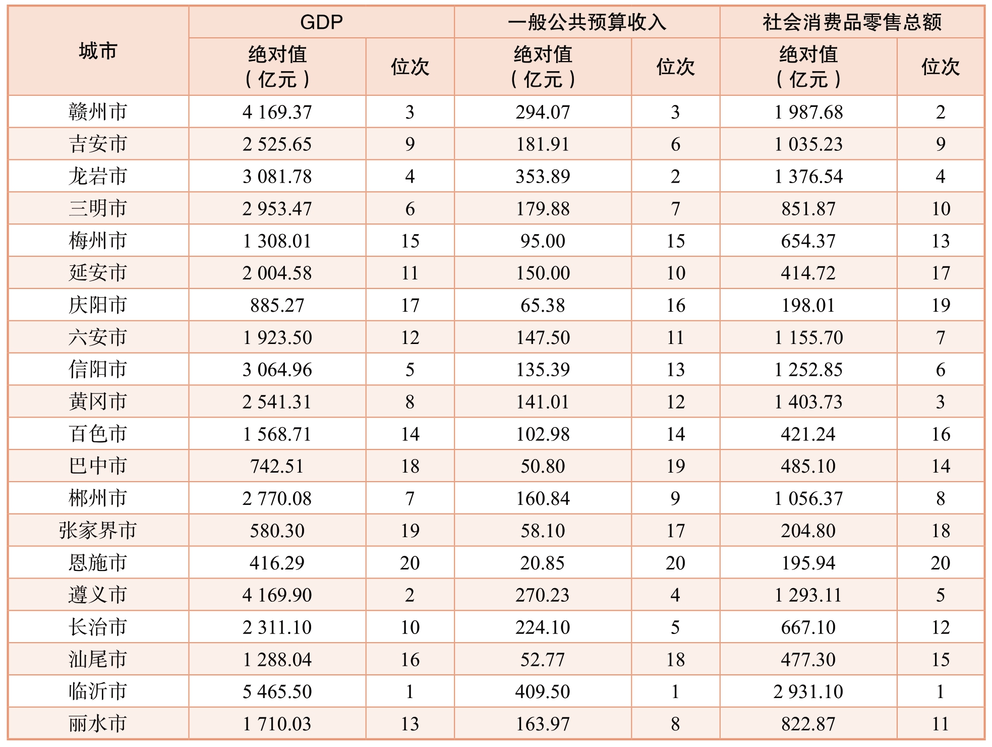 (2)从经济规模看,赣州是经济大市,但与革命老区头部城市相比仍有较大差距。2021年赣州市GDP(4 169.37亿元)、一般公共预算收入(294.07亿元)、社会消费品零售总额(1 987.68亿元),分列20个革命老区重点城市第3、3、2位,但与第1位的临沂市(GDP 5 465.5亿元、一般公共预算收入409.5亿元、社会消费品零售总额2 931.1亿元)相比,3项主要经济指标仅为其76.3%、71.8%、67.8%,经济总量与革命老区头部城市相比仍有较大差距,如表1-19所示。