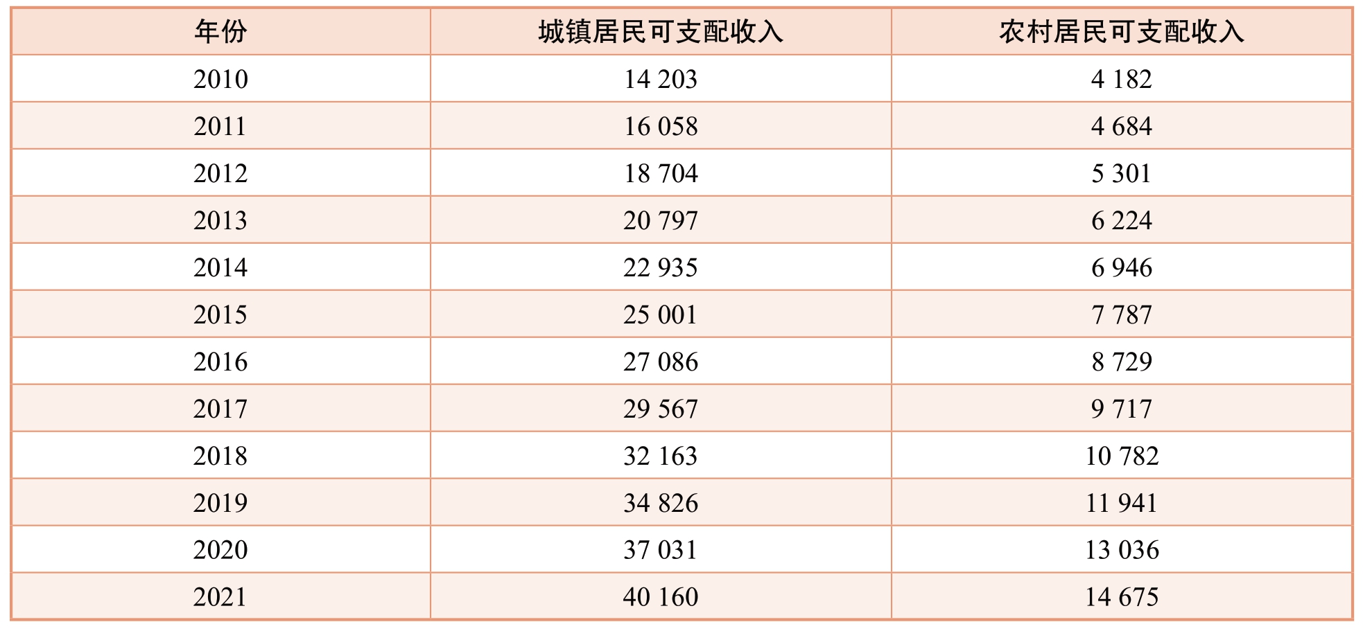 表1-3 2010—2021年赣州市城乡居民人均可支配收入情况 单位:元