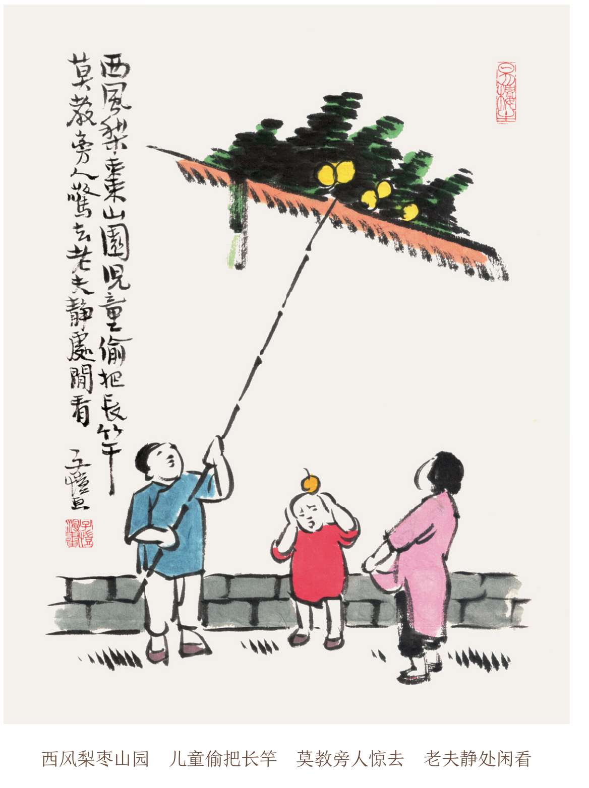 西风梨枣山园,儿童偷把长竿。莫遣旁人惊去,老夫静处闲看。