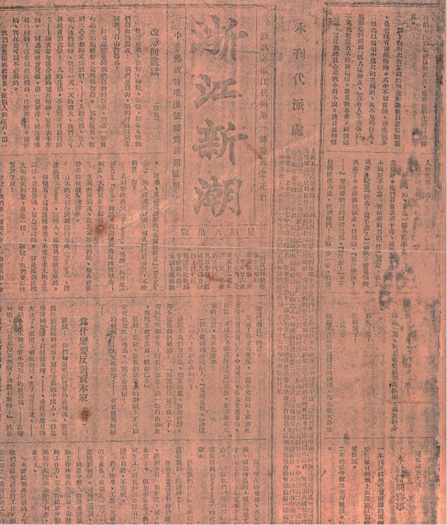 “与时俱进”一词最早出现于清末蔡元培先生的论著《中国伦理学史》(1910年)中,其真正成为改革运动的口号则是在1919年“五四运动”前后的浙江省立第一师范学校。时任校长经亨颐实行“与时俱进”的办学方针,大胆试行职员专任、学生自治、改授国语和学科制四项改革。他所聘请的四位积极传播新文化的新派语文教员陈望道、刘大白、李次九、夏丏尊,号称“四大金刚”。在他们的倡导下,学生中掀起了阅读进步书刊和追求新思想的热潮,一师成为浙江新文化运动的中心。1919年秋,在经亨颐的支持下,一师学生拒绝参加浙江“祭孔”大典。11月7日,在学生自办刊物《浙江新潮》第二期上刊出了一师学生施存统所写的《非孝》一文,文章主张在家庭中用平等的爱来代替不平等的孝道,在社会上引起轩然大波。地方当局和省教育厅厅长责令开除施存统、解聘“四大金刚”,遭经亨颐拒绝。12月2日,《浙江新潮》被查禁。