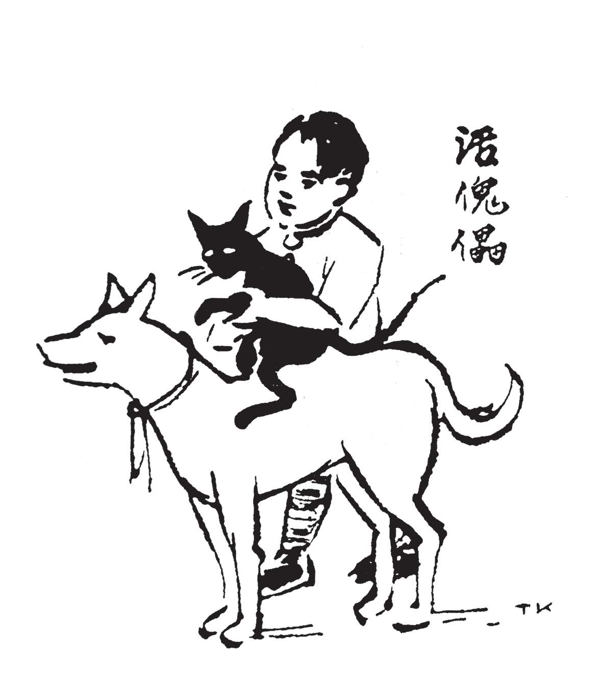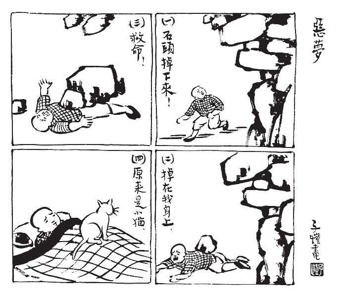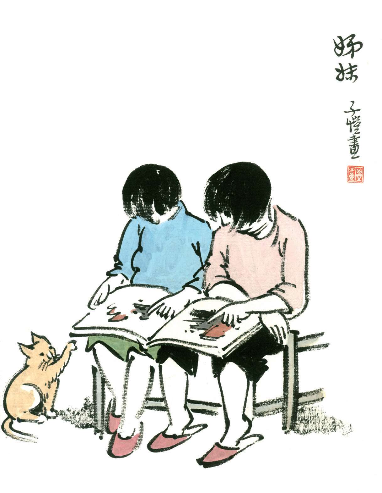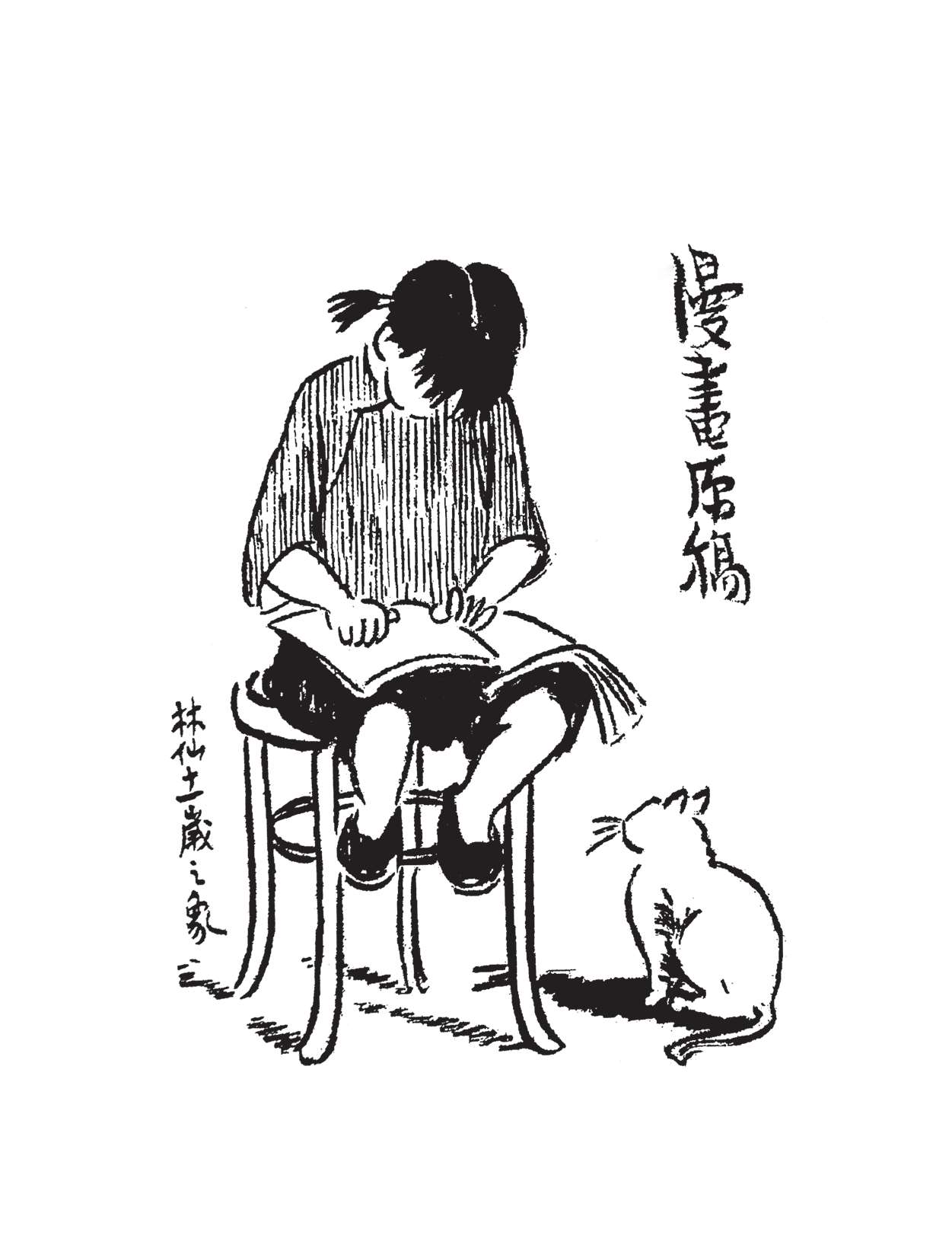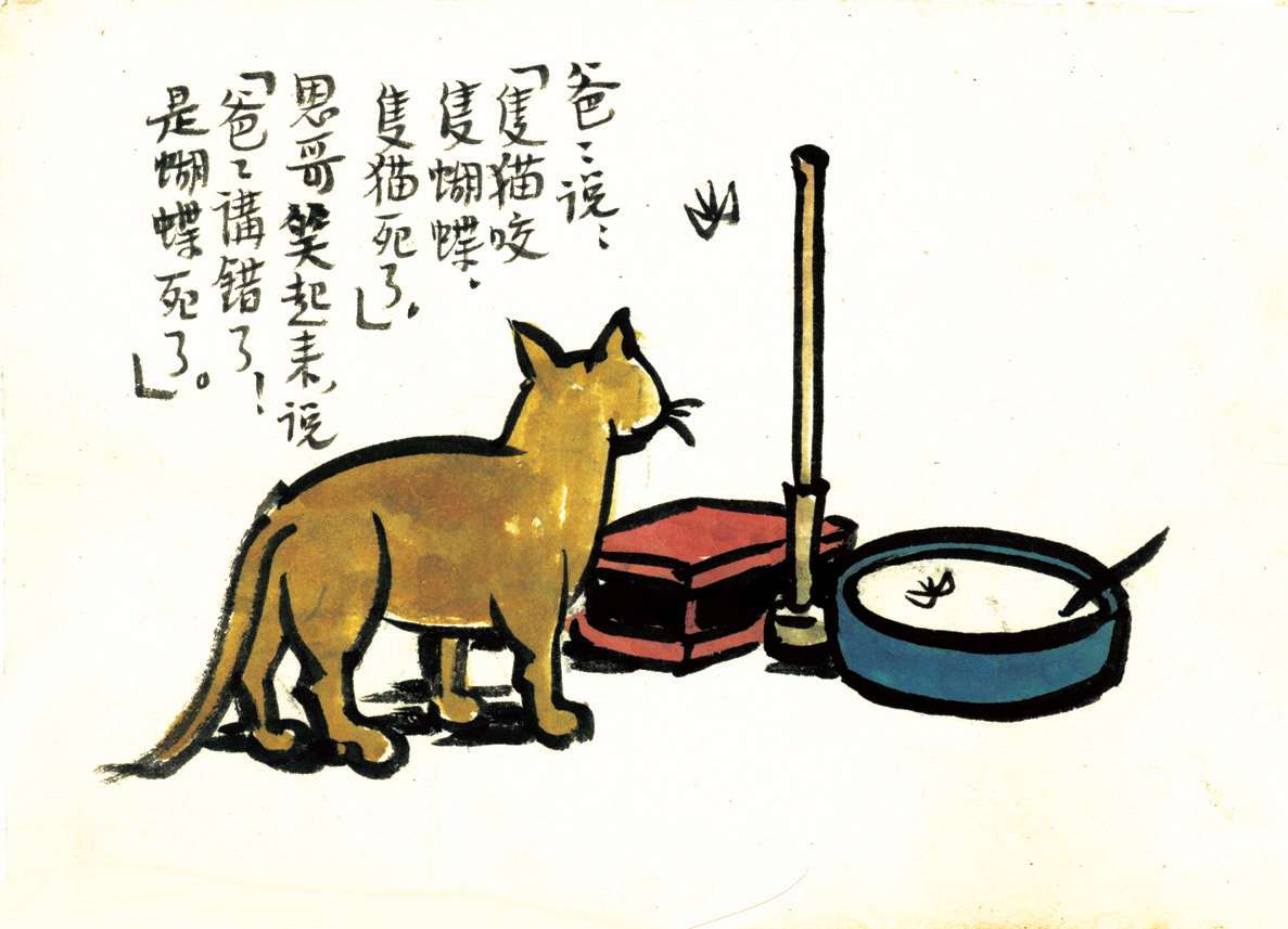写到这里,我回想起已故的黄猫来了。这猫名叫“猫伯伯”。在我们故乡,伯伯不一定是尊称。我们称鬼为“鬼伯伯”,称贼为“贼伯伯”。故猫也不妨称为“猫伯伯”。大约对于特殊而引人注目的人物,都可讥讽地称之为伯伯。这猫的确是特殊而引人注目的。我的女儿最喜欢它。有时她正在写稿,忽然猫伯伯跳上书桌来,面对着她,端端正正地坐在稿纸上了。她不忍驱逐,就放下了笔,和它玩耍一会。有时它竟盘拢身体,就在稿纸上睡觉了,身体仿佛一堆牛粪,正好装满了一张稿纸。有一天,来了一位难得光临的贵客。我正襟危坐,专心应对。“久仰久仰”,“岂敢岂敢”,有似演剧。忽然猫伯伯跳上矮桌来,嗅嗅贵客的衣袖。我觉得太唐突,想赶走它。贵客却抚它的背,极口称赞:“这猫真好!”话头转向了猫,紧张的演剧就变成了和乐的闲谈。后来我把猫伯伯抱开,放在地上,希望它去了,好让我们演完这一幕。岂知过得不久,忽然猫伯伯跳到沙发背后,迅速地爬上贵客的背脊,端端正正地坐在他的后颈上了!这贵客身体魁梧奇伟,背脊颇有些驼,坐着喝茶时,猫伯伯看来是个小山坡,爬上去很不吃力。此时我但见贵客的天官赐福的面孔上方,露出一个威风凛凛的猫头,画出来真好看呢!我以主人口气呵斥猫伯伯的无礼,一面起身捉猫。但贵客摇手阻止,把头低下,使山坡平坦些,让猫伯伯坐得舒服。如此甚好,我也何必做杀风景的主人呢?于是主客关系亲密起来,交情深入了一步。