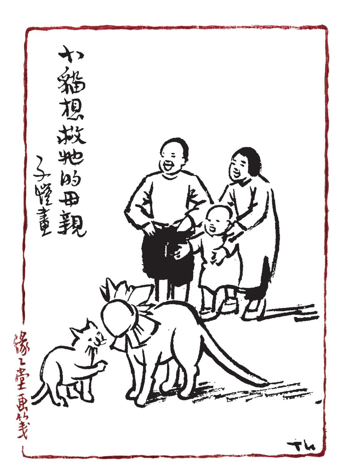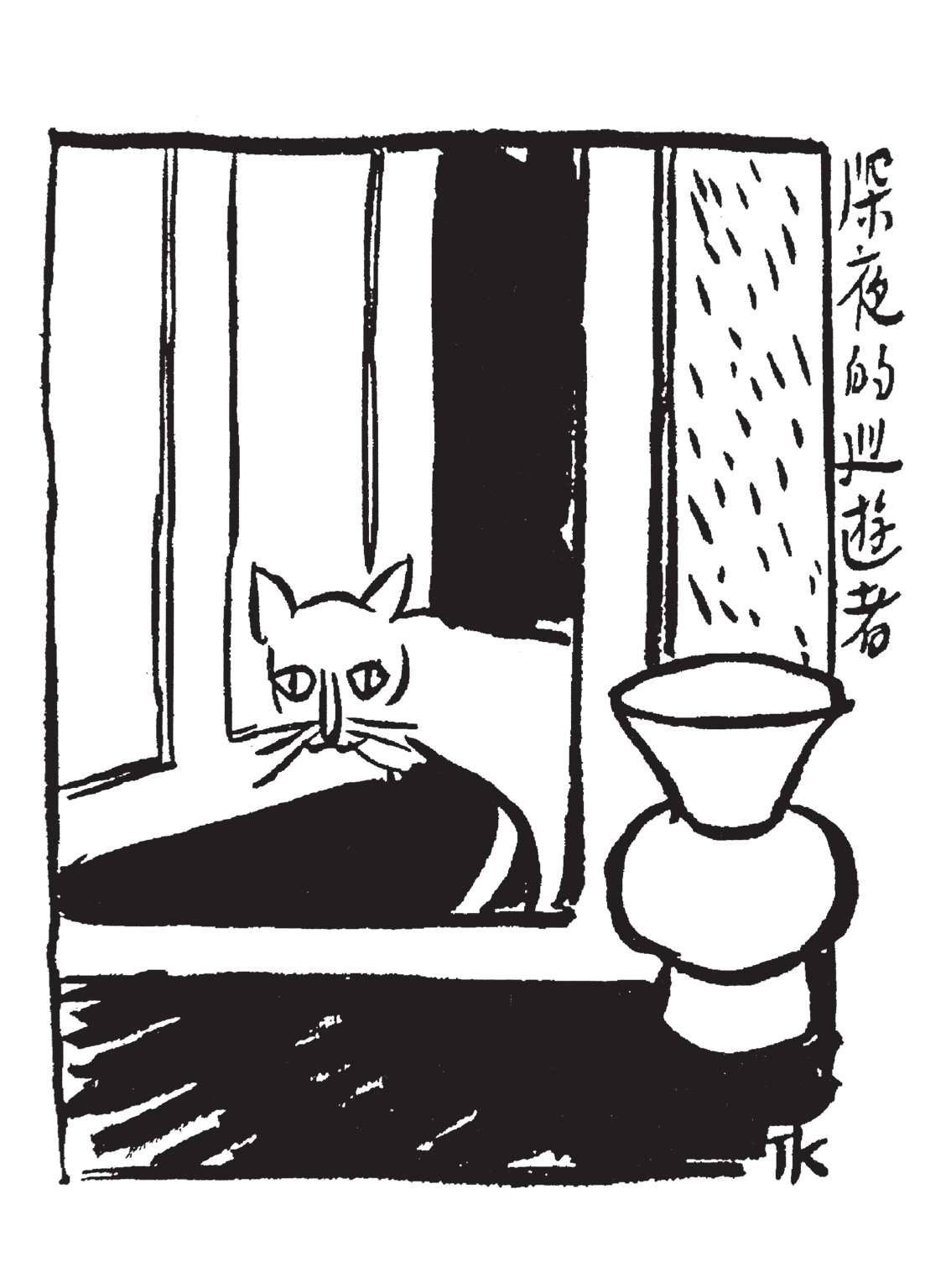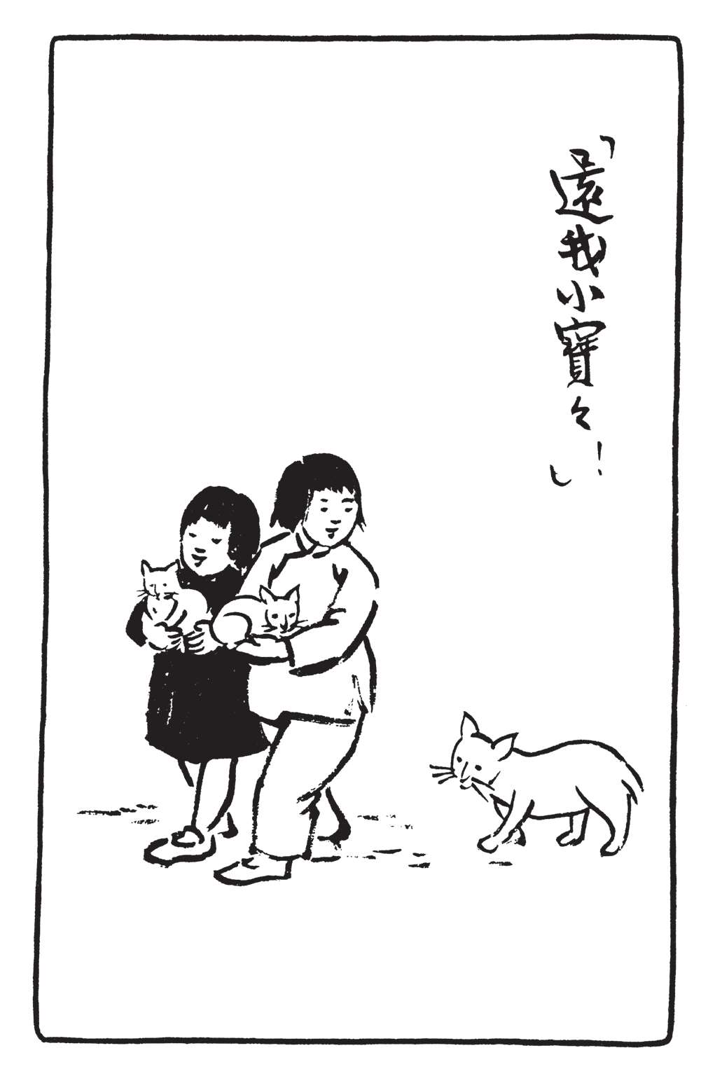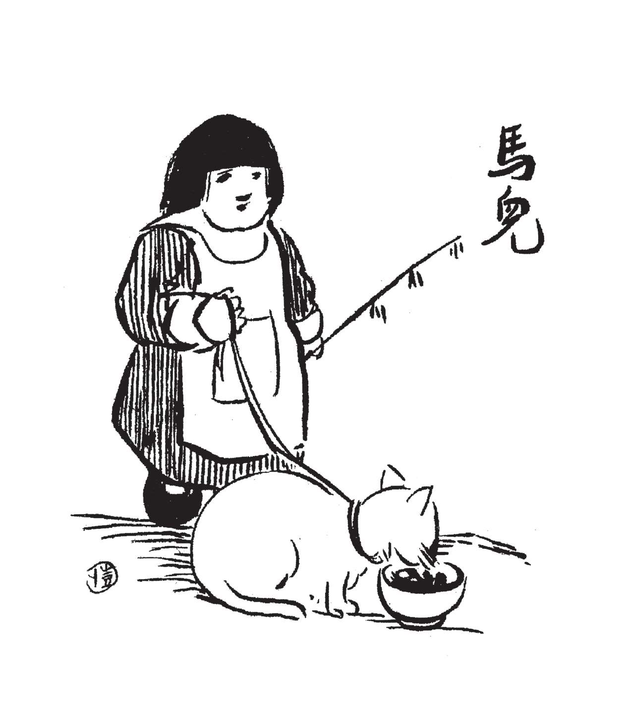 写到这里,我回想起已故的黄猫来了。这猫名叫“猫伯伯”。在我们故乡,伯伯不一定是尊称。我们称鬼为“鬼伯伯”,称贼为“贼伯伯”。故猫也不妨称为“猫伯伯”。大约对于特殊而引人注目的人物,都可讥讽地称之为伯伯。这猫的确是特殊而引人注目的。我的女儿最喜欢它。有时她正在写稿,忽然猫伯伯跳上书桌来,面对着她,端端正正地坐在稿纸上了。她不忍驱逐,就放下了笔,和它玩耍一会。有时它竟盘拢身体,就在稿纸上睡觉了,身体仿佛一堆牛粪,正好装满了一张稿纸。有一天,来了一位难得光临的贵客。我正襟危坐,专心应对。“久仰久仰”,“岂敢岂敢”,有似演剧。忽然猫伯伯跳上矮桌来,嗅嗅贵客的衣袖。我觉得太唐突,想赶走它。贵客却抚它的背,极口称赞:“这猫真好!”话头转向了猫,紧张的演剧就变成了和乐的闲谈。后来我把猫伯伯抱开,放在地上,希望它去了,好让我们演完这一幕。岂知过得不久,忽然猫伯伯跳到沙发背后,迅速地爬上贵客的背脊,端端正正地坐在他的后颈上了!这贵客身体魁梧奇伟,背脊颇有些驼,坐着喝茶时,猫伯伯看来是个小山坡,爬上去很不吃力。此时我但见贵客的天官赐福的面孔上方,露出一个威风凛凛的猫头,画出来真好看呢!我以主人口气呵斥猫伯伯的无礼,一面起身捉猫。但贵客摇手阻止,把头低下,使山坡平坦些,让猫伯伯坐得舒服。如此甚好,我也何必做杀风景的主人呢?于是主客关系亲密起来,交情深入了一步。