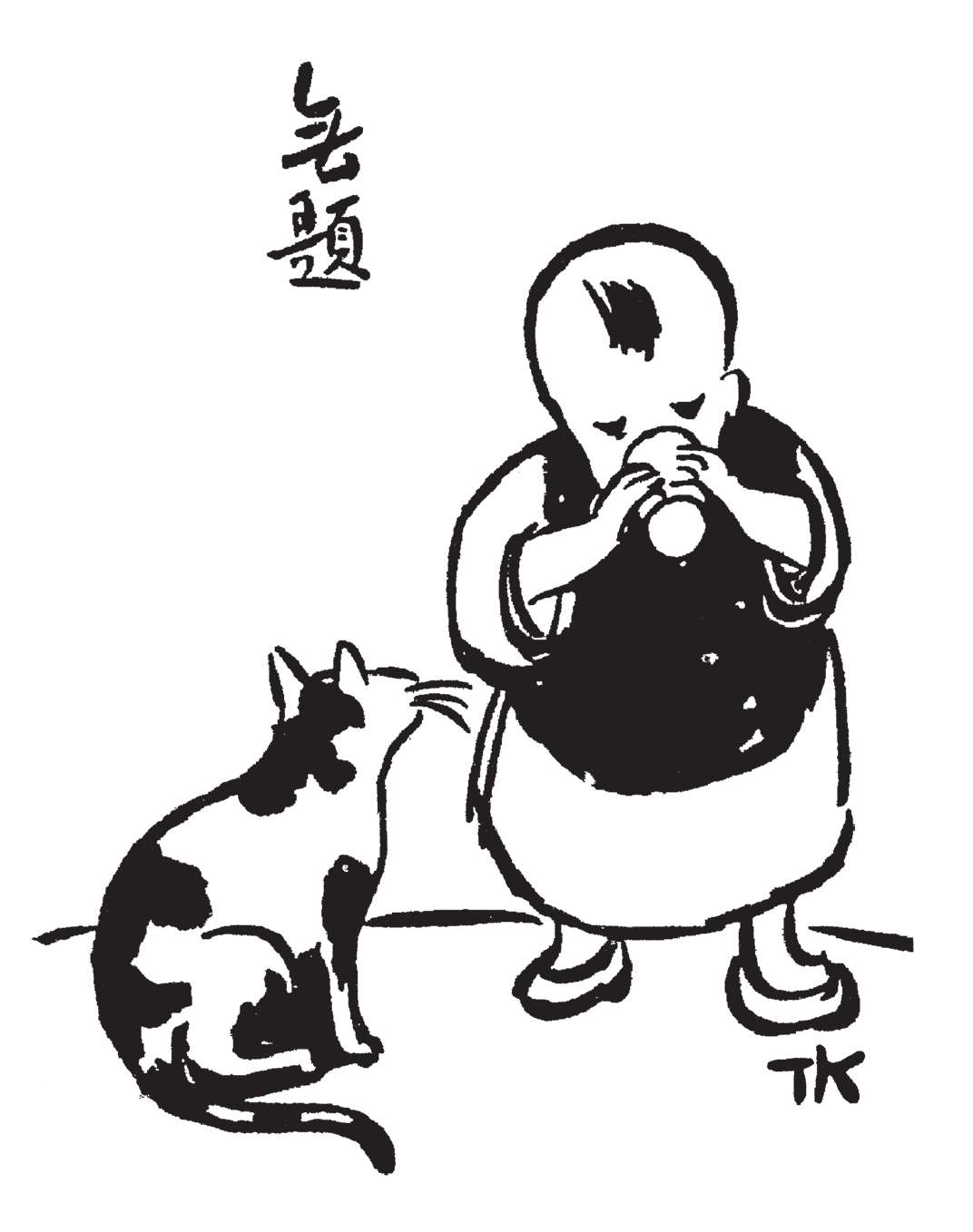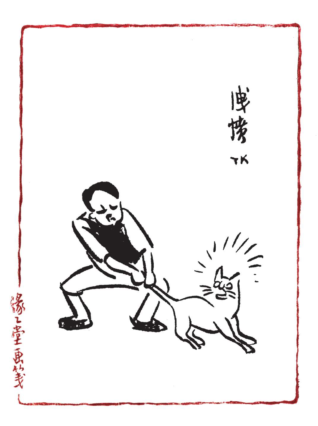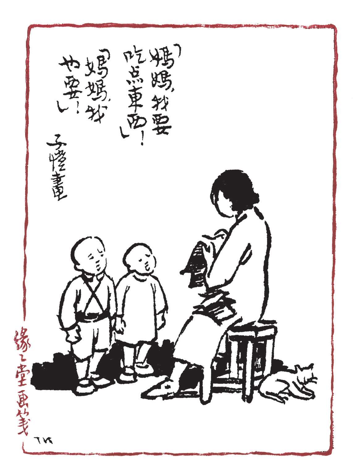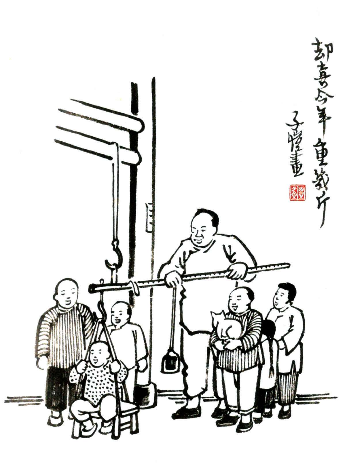 写到这里,我回想起已故的黄猫来了。这猫名叫“猫伯伯”。在我们故乡,伯伯不一定是尊称。我们称鬼为“鬼伯伯”,称贼为“贼伯伯”。故猫也不妨称为“猫伯伯”。大约对于特殊而引人注目的人物,都可讥讽地称之为伯伯。这猫的确是特殊而引人注目的。我的女儿最喜欢它。有时她正在写稿,忽然猫伯伯跳上书桌来,面对着她,端端正正地坐在稿纸上了。她不忍驱逐,就放下了笔,和它玩耍一会。有时它竟盘拢身体,就在稿纸上睡觉了,身体仿佛一堆牛粪,正好装满了一张稿纸。有一天,来了一位难得光临的贵客。我正襟危坐,专心应对。“久仰久仰”,“岂敢岂敢”,有似演剧。忽然猫伯伯跳上矮桌来,嗅嗅贵客的衣袖。我觉得太唐突,想赶走它。贵客却抚它的背,极口称赞:“这猫真好!”话头转向了猫,紧张的演剧就变成了和乐的闲谈。后来我把猫伯伯抱开,放在地上,希望它去了,好让我们演完这一幕。岂知过得不久,忽然猫伯伯跳到沙发背后,迅速地爬上贵客的背脊,端端正正地坐在他的后颈上了!这贵客身体魁梧奇伟,背脊颇有些驼,坐着喝茶时,猫伯伯看来是个小山坡,爬上去很不吃力。此时我但见贵客的天官赐福的面孔上方,露出一个威风凛凛的猫头,画出来真好看呢!我以主人口气呵斥猫伯伯的无礼,一面起身捉猫。但贵客摇手阻止,把头低下,使山坡平坦些,让猫伯伯坐得舒服。如此甚好,我也何必做杀风景的主人呢?于是主客关系亲密起来,交情深入了一步。