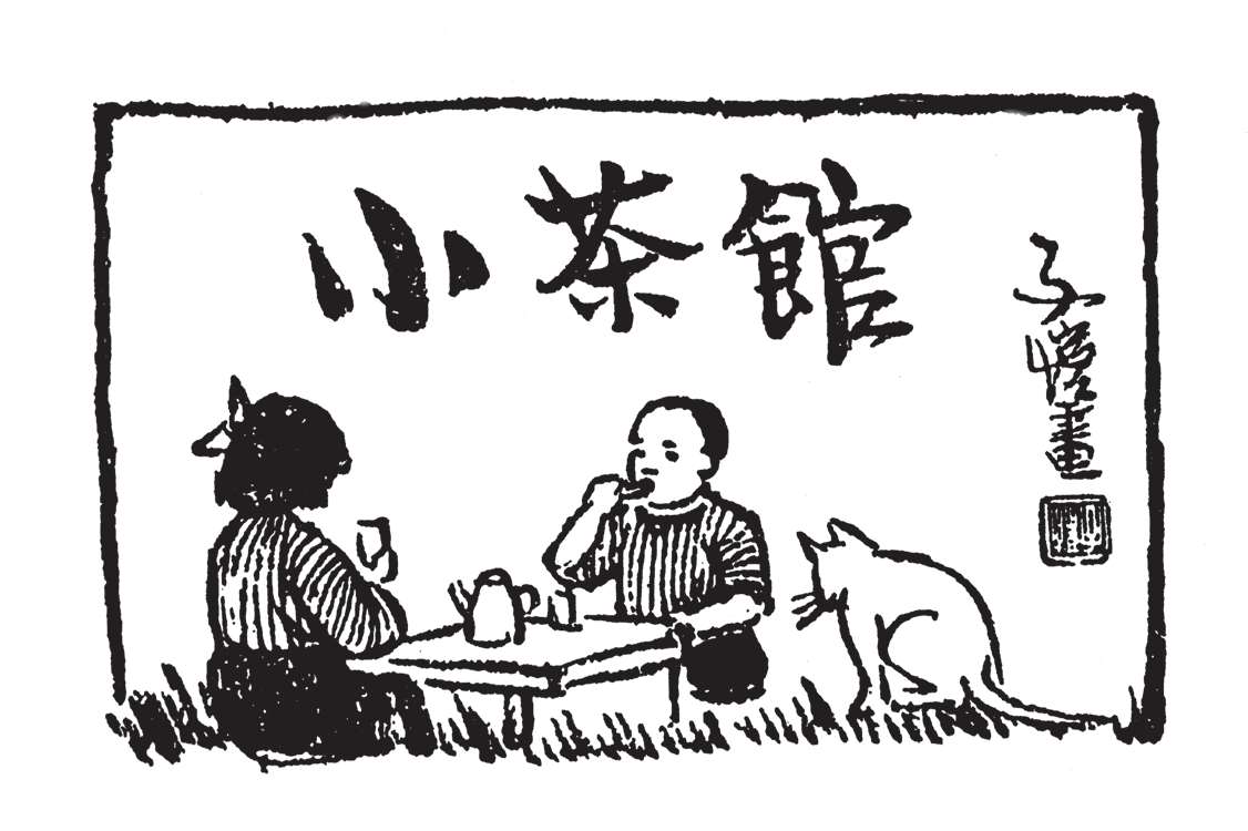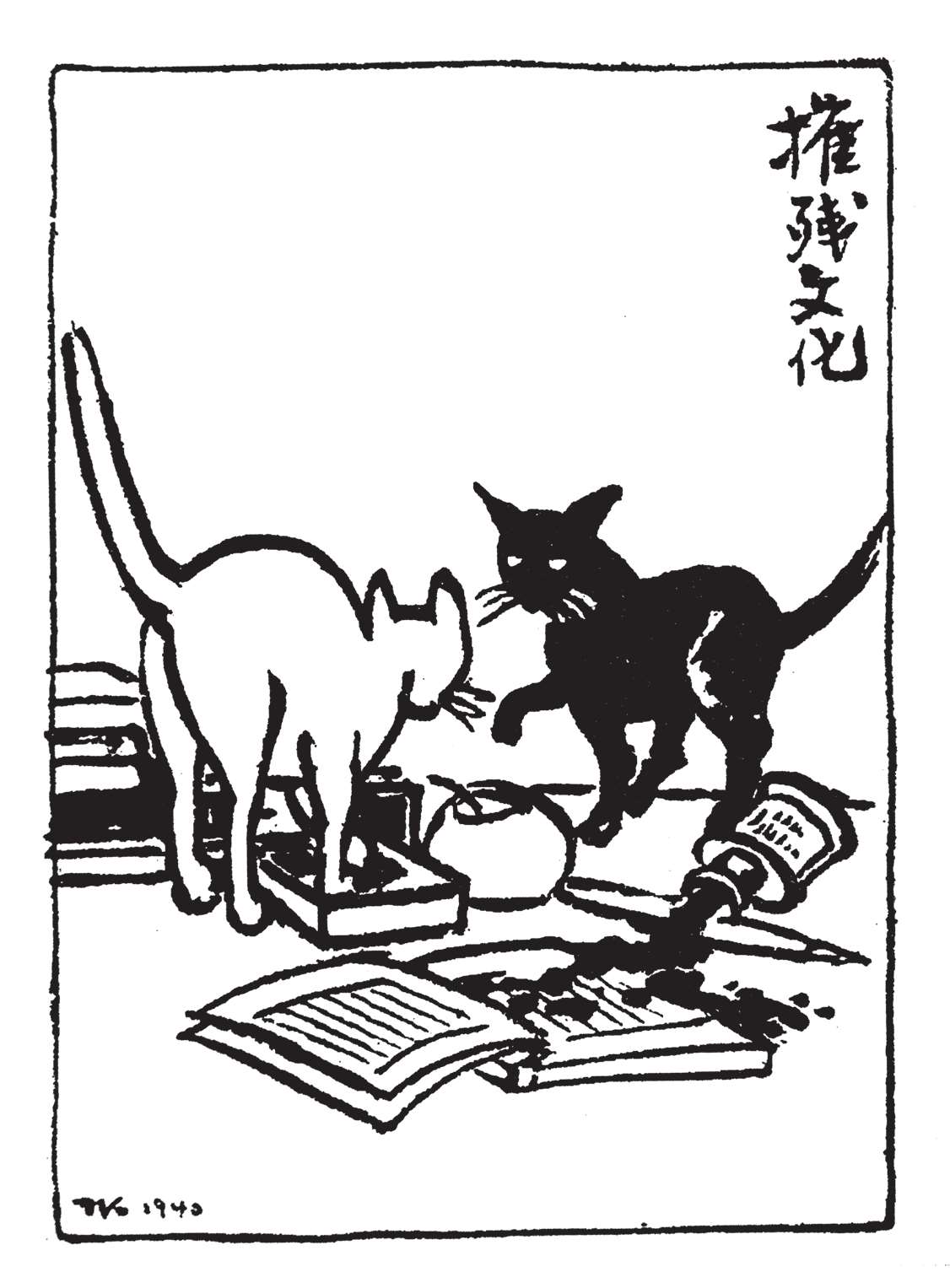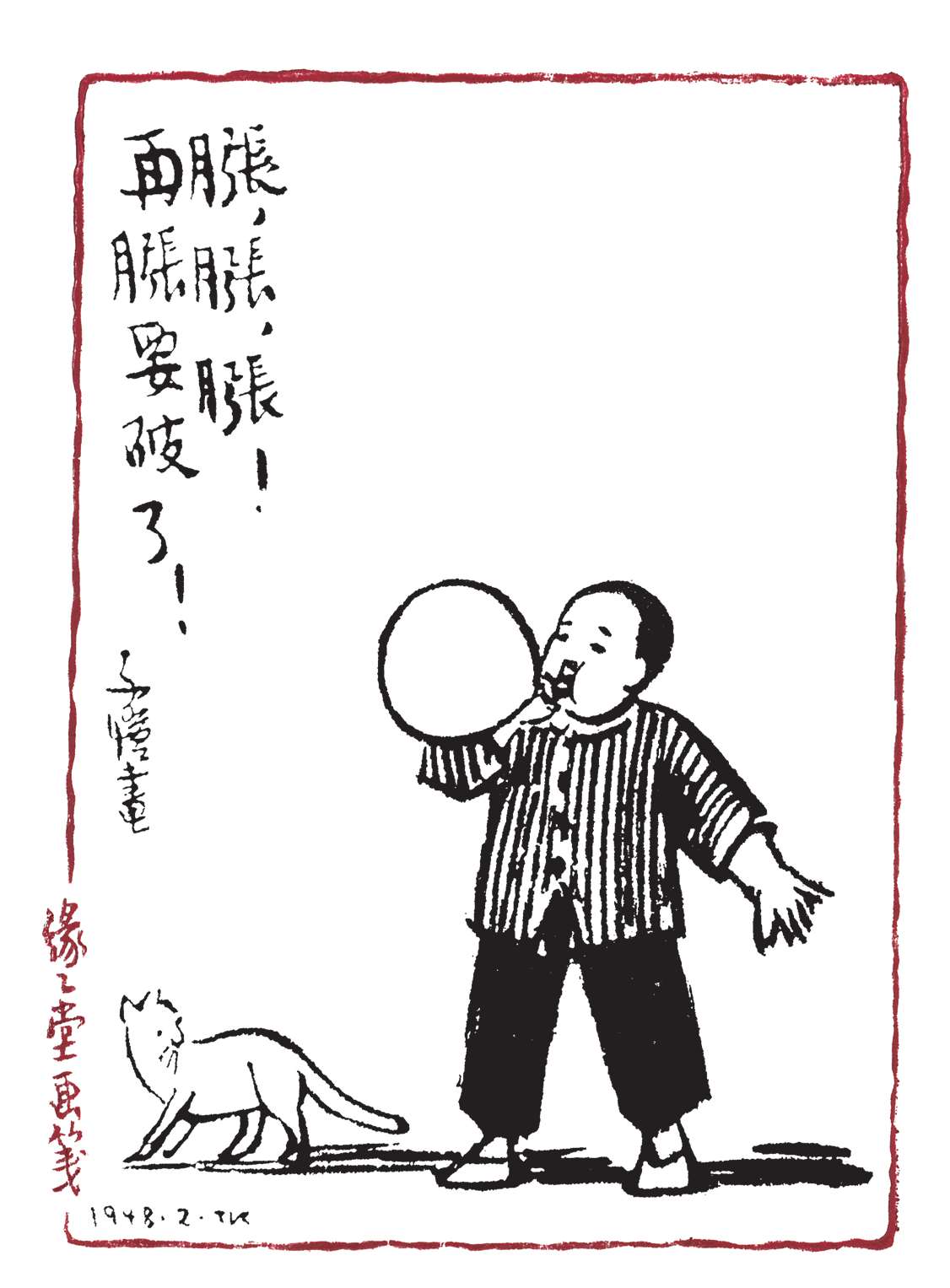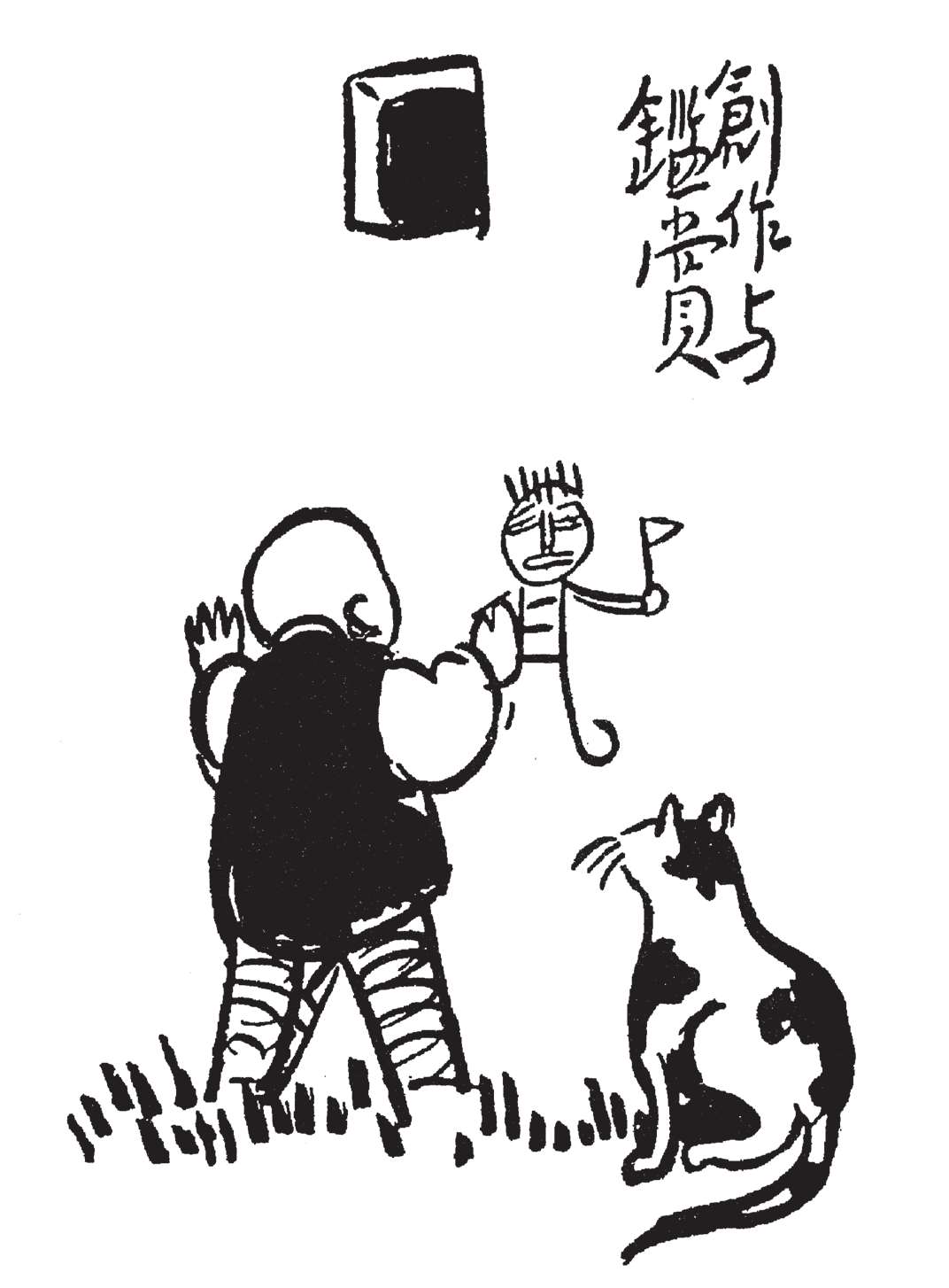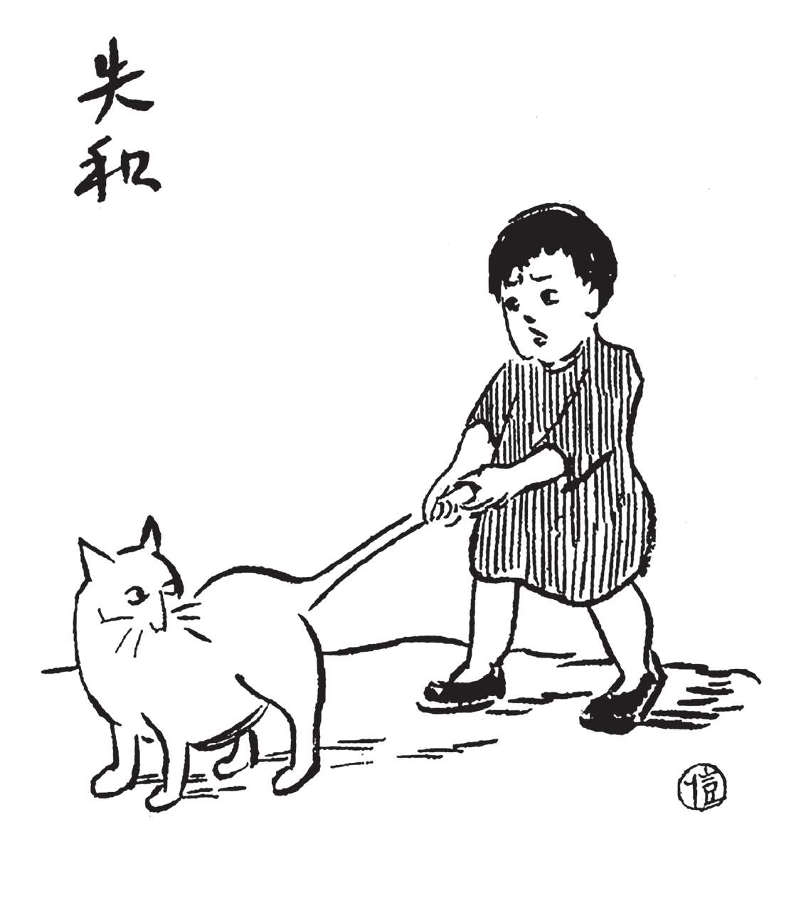 写到这里,我回想起已故的黄猫来了。这猫名叫“猫伯伯”。在我们故乡,伯伯不一定是尊称。我们称鬼为“鬼伯伯”,称贼为“贼伯伯”。故猫也不妨称为“猫伯伯”。大约对于特殊而引人注目的人物,都可讥讽地称之为伯伯。这猫的确是特殊而引人注目的。我的女儿最喜欢它。有时她正在写稿,忽然猫伯伯跳上书桌来,面对着她,端端正正地坐在稿纸上了。她不忍驱逐,就放下了笔,和它玩耍一会。有时它竟盘拢身体,就在稿纸上睡觉了,身体仿佛一堆牛粪,正好装满了一张稿纸。有一天,来了一位难得光临的贵客。我正襟危坐,专心应对。“久仰久仰”,“岂敢岂敢”,有似演剧。忽然猫伯伯跳上矮桌来,嗅嗅贵客的衣袖。我觉得太唐突,想赶走它。贵客却抚它的背,极口称赞:“这猫真好!”话头转向了猫,紧张的演剧就变成了和乐的闲谈。后来我把猫伯伯抱开,放在地上,希望它去了,好让我们演完这一幕。岂知过得不久,忽然猫伯伯跳到沙发背后,迅速地爬上贵客的背脊,端端正正地坐在他的后颈上了!这贵客身体魁梧奇伟,背脊颇有些驼,坐着喝茶时,猫伯伯看来是个小山坡,爬上去很不吃力。此时我但见贵客的天官赐福的面孔上方,露出一个威风凛凛的猫头,画出来真好看呢!我以主人口气呵斥猫伯伯的无礼,一面起身捉猫。但贵客摇手阻止,把头低下,使山坡平坦些,让猫伯伯坐得舒服。如此甚好,我也何必做杀风景的主人呢?于是主客关系亲密起来,交情深入了一步。