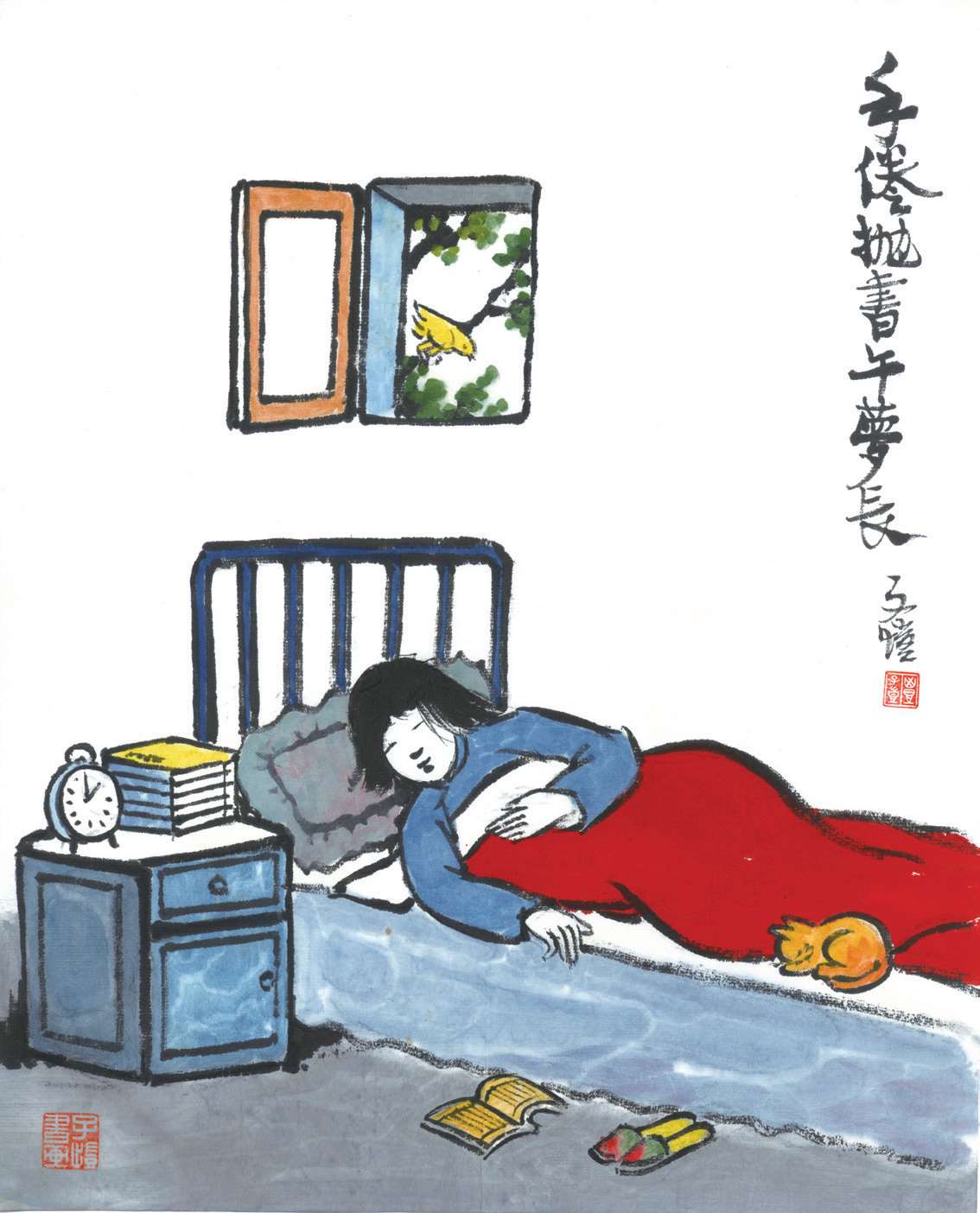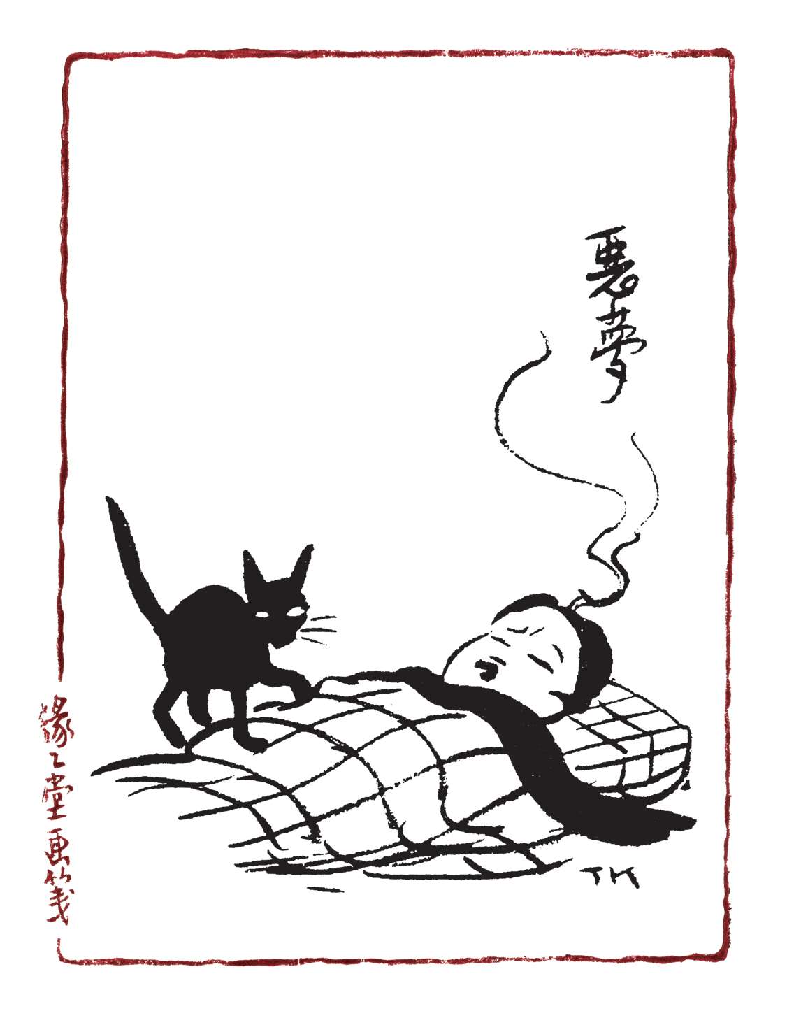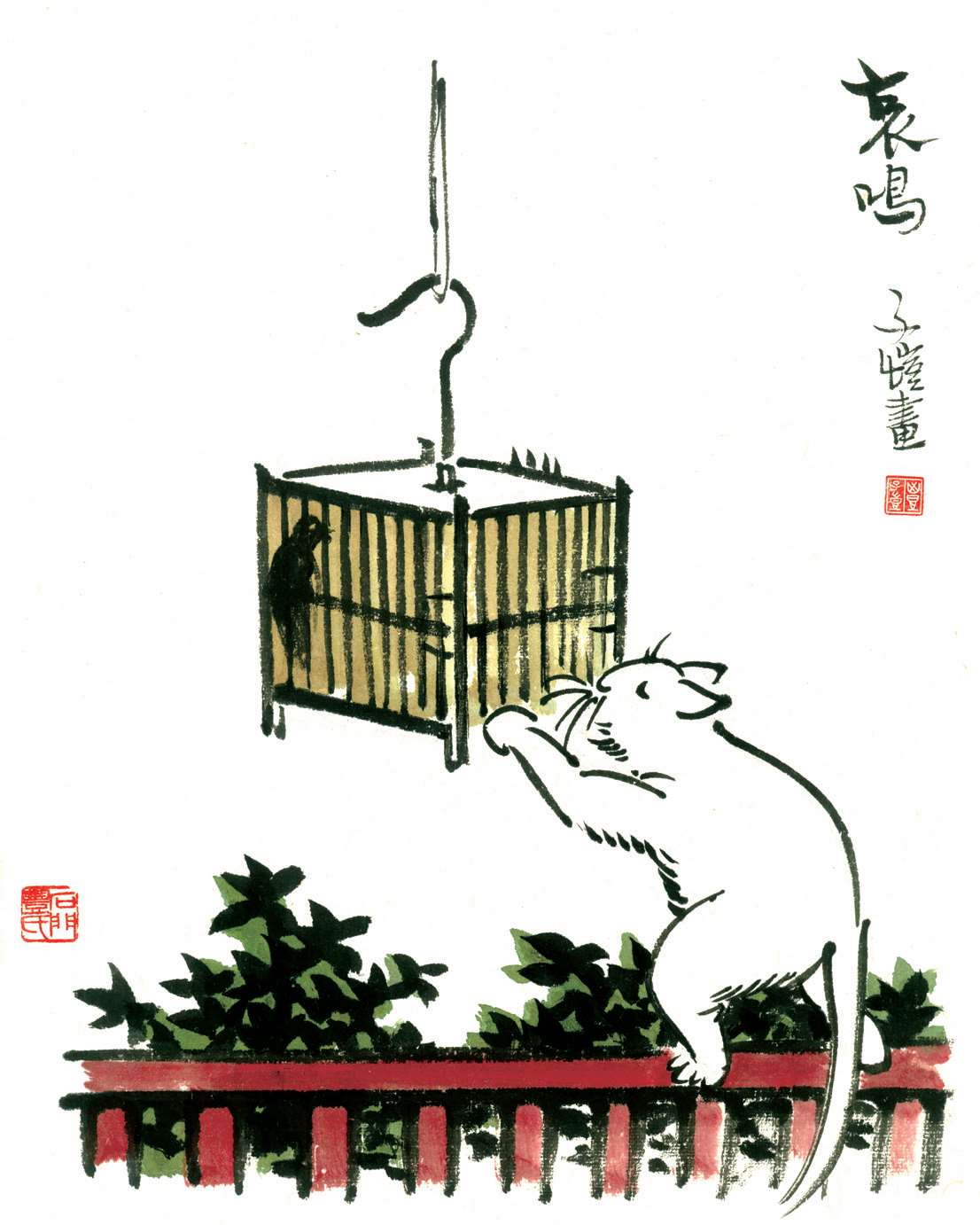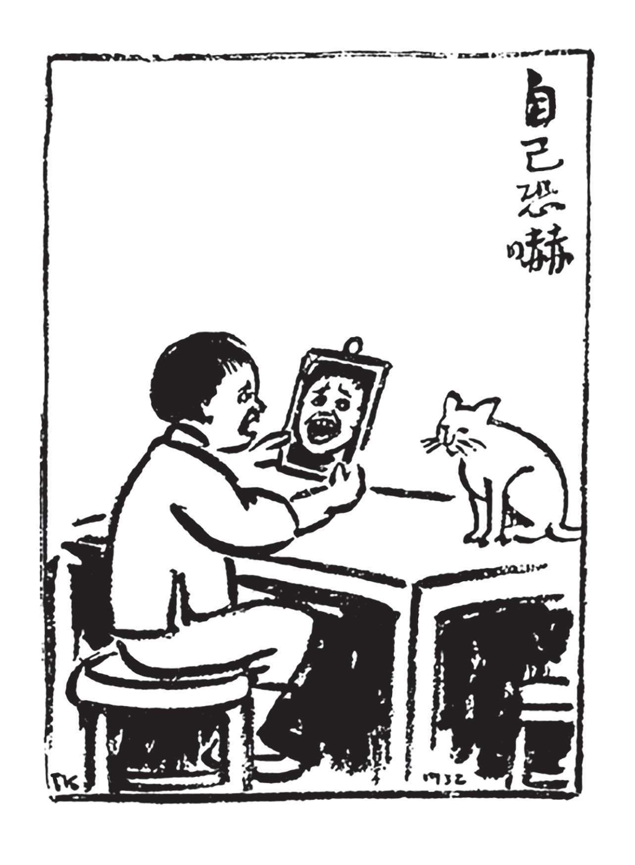 写到这里,我回想起已故的黄猫来了。这猫名叫“猫伯伯”。在我们故乡,伯伯不一定是尊称。我们称鬼为“鬼伯伯”,称贼为“贼伯伯”。故猫也不妨称为“猫伯伯”。大约对于特殊而引人注目的人物,都可讥讽地称之为伯伯。这猫的确是特殊而引人注目的。我的女儿最喜欢它。有时她正在写稿,忽然猫伯伯跳上书桌来,面对着她,端端正正地坐在稿纸上了。她不忍驱逐,就放下了笔,和它玩耍一会。有时它竟盘拢身体,就在稿纸上睡觉了,身体仿佛一堆牛粪,正好装满了一张稿纸。有一天,来了一位难得光临的贵客。我正襟危坐,专心应对。“久仰久仰”,“岂敢岂敢”,有似演剧。忽然猫伯伯跳上矮桌来,嗅嗅贵客的衣袖。我觉得太唐突,想赶走它。贵客却抚它的背,极口称赞:“这猫真好!”话头转向了猫,紧张的演剧就变成了和乐的闲谈。后来我把猫伯伯抱开,放在地上,希望它去了,好让我们演完这一幕。岂知过得不久,忽然猫伯伯跳到沙发背后,迅速地爬上贵客的背脊,端端正正地坐在他的后颈上了!这贵客身体魁梧奇伟,背脊颇有些驼,坐着喝茶时,猫伯伯看来是个小山坡,爬上去很不吃力。此时我但见贵客的天官赐福的面孔上方,露出一个威风凛凛的猫头,画出来真好看呢!我以主人口气呵斥猫伯伯的无礼,一面起身捉猫。但贵客摇手阻止,把头低下,使山坡平坦些,让猫伯伯坐得舒服。如此甚好,我也何必做杀风景的主人呢?于是主客关系亲密起来,交情深入了一步。