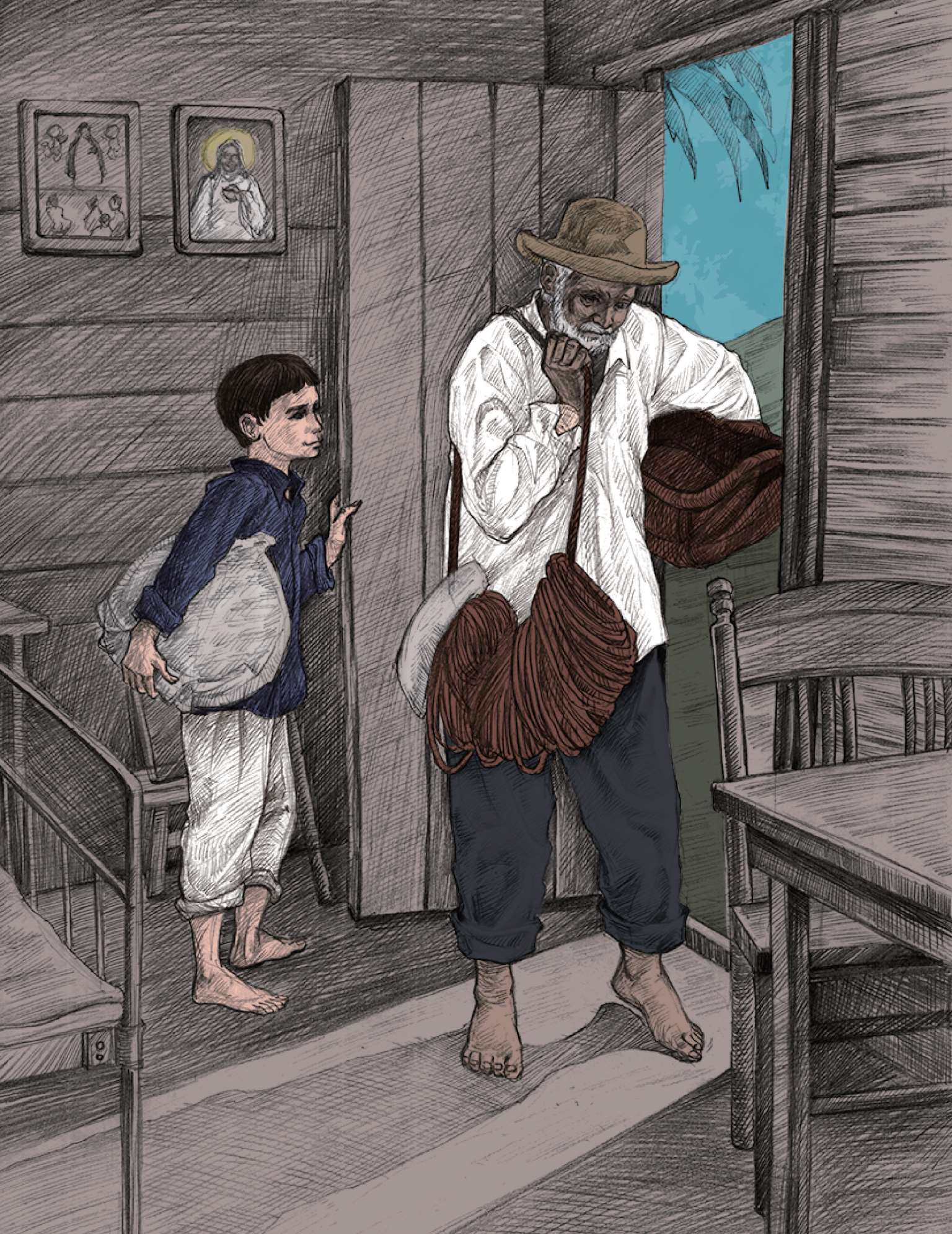 男孩儿住的房子的门没有上锁。他推开门,光着脚悄悄地走了进去。男孩儿在第一间屋的一张帆布床上熟睡了,借着外面残月射进来的光线,老人把男孩儿看得一清二楚。他轻轻握住男孩儿的一只脚,直到男孩儿醒来,并转过头看着他。老人点点头,男孩儿拿起床边椅子上的裤子,坐在床沿上把裤子穿上。