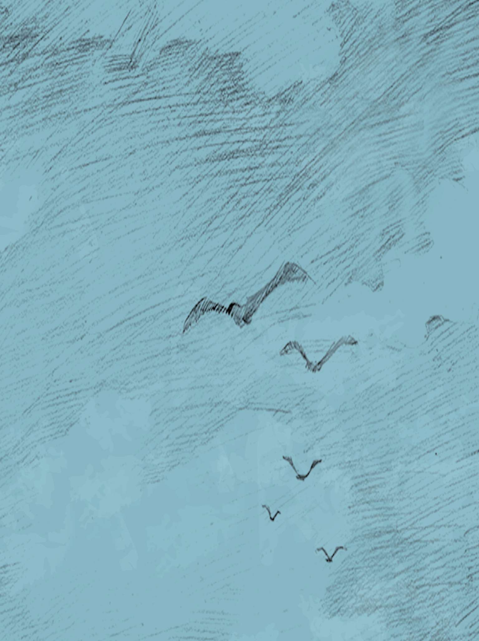 此时,男孩儿拿着沙丁鱼和两份包在报纸中的鱼饵回来了。于是他们顺着小径,踏着布满了卵石的沙子走向小船儿。他们抬起小船儿,把小船儿滑进水中。