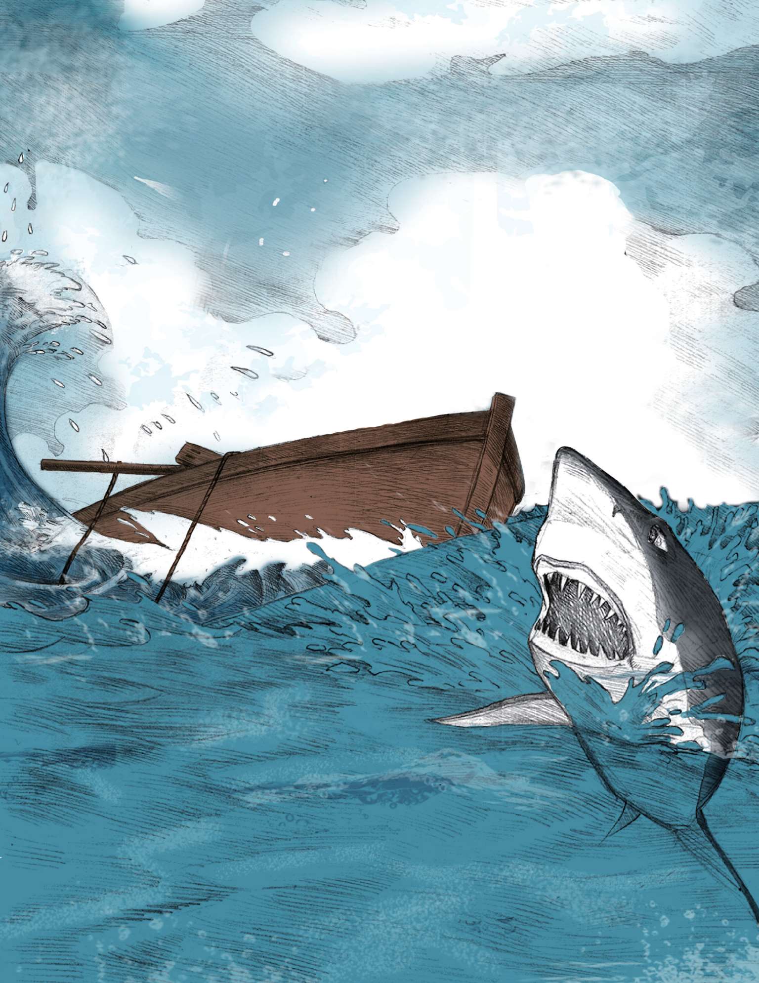 “我记得鱼的尾巴不断地拍打,猛烈地撞来撞去,横座板都被撞断了,还有用棍棒敲打鱼的声音。我还记得你把我扔进船头,那里堆着湿漉漉的卷着的钓鱼线。我感到整条船儿都在摇晃,还听到你用棍棒敲打那家伙的声音,就像把一棵树砍倒一样,我浑身上下都能嗅到带有汗的血腥味儿。”