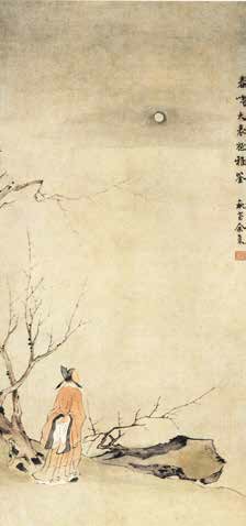 这是一张好画儿。设色清秀,构图简净,余味悠长。梅花几乎还没有开,画中人负手望月,留给我们一个背影。他在想什么呢?