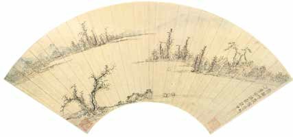 诗意图不拘形式。即使是一面小小的扇页,也能画出尺幅千里之感。黄昏了,水上雾气迷蒙,树叶染上微黄,远山是一抹似有似无的蓝。画面右端的题字,用了篆书。仔细看看,不正是“寒树依微远天外,夕阳明灭乱流中”吗?