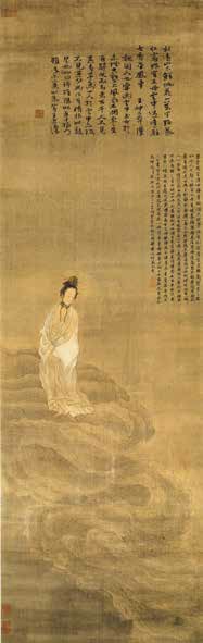 崔子忠是明代著名的人物画家,与陈洪绶齐名,虽然两人风格迥异,却各有奇趣。本幅构图便不循常理,飘然有仙气。玉女腾云行空,远在红尘之上,俯视下界。她穿得可少了,白衣飘飘,当真是一位耐冷的“婵娟”。