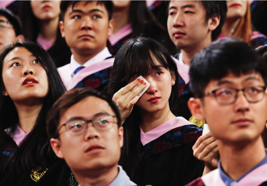 2017年7月4日,在北京大学2017年本科生毕业典礼暨学位授予仪式上,毕业生看着毕业纪念片不禁落泪。这一年该校共有3358名本科生毕业。
