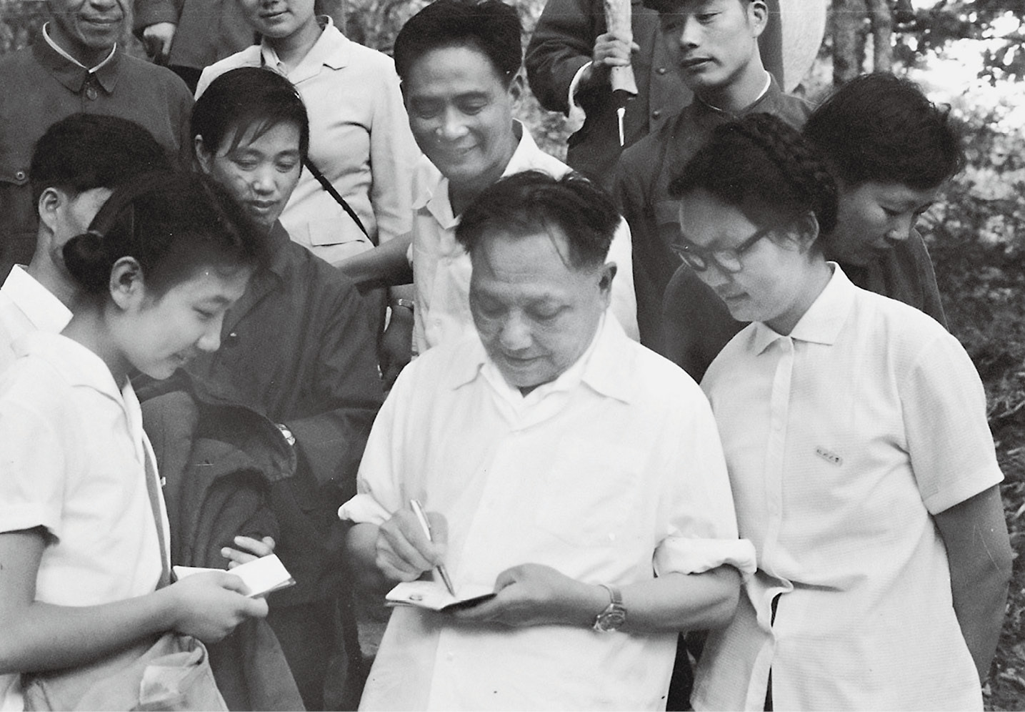 1979年7月,在登黄山途中,邓小平为闻讯赶来的大学生签名留念。